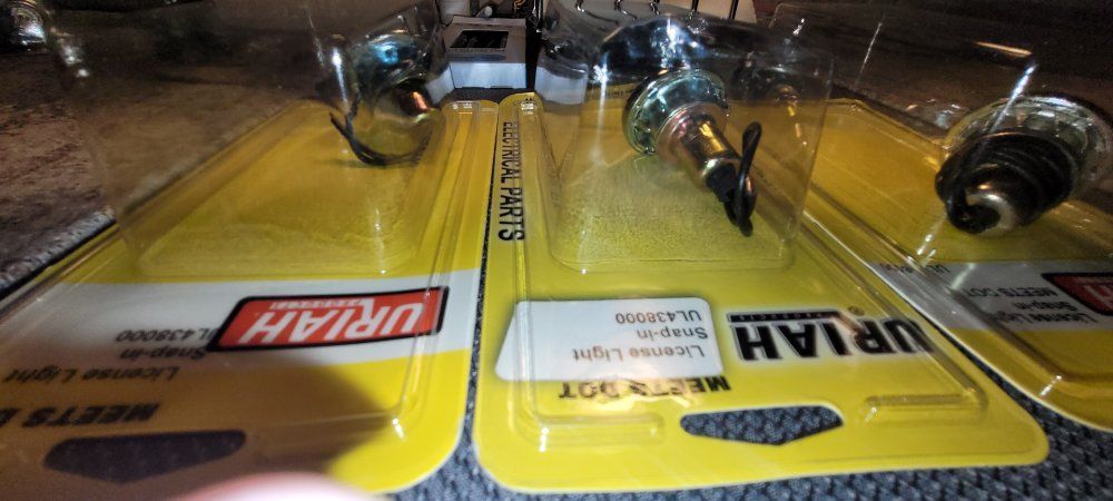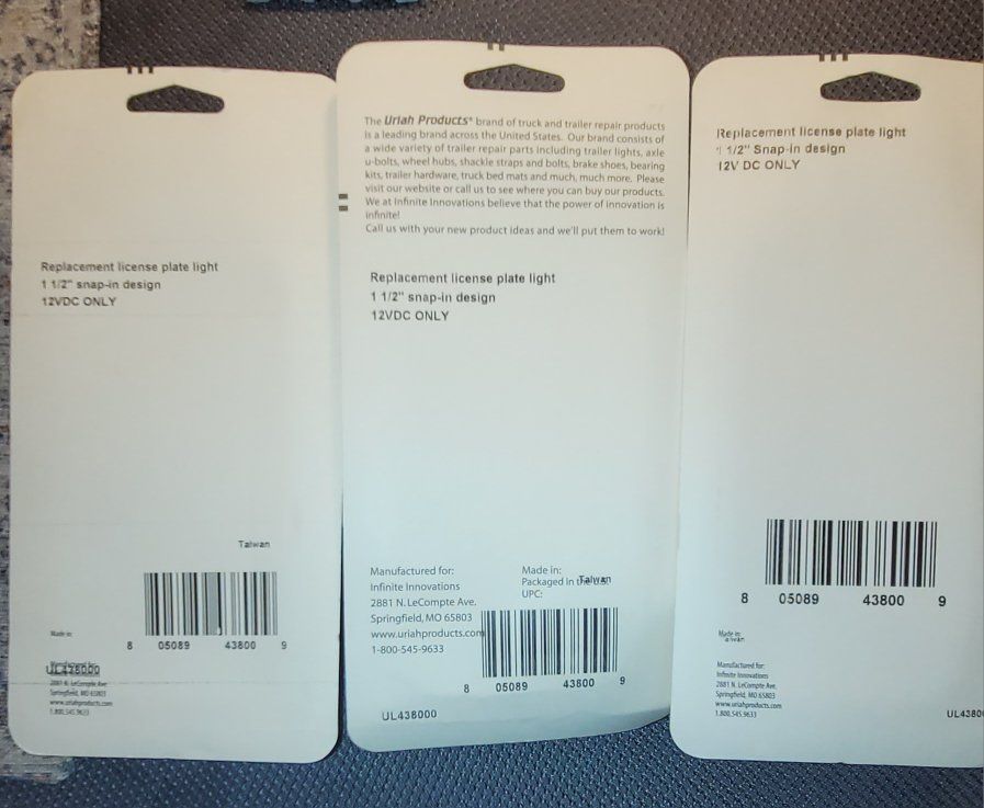 Uriah Products ul 438000 Snap-in , a compact lamp designed for vehicle illumination. Usage: Designed to fit in a 1-1/4" hole for applications requiring compact lighting, such as license plates. Design: Features a snap-in steel construction with a chrome finish and a translucent white plastic lens. Specifications: Operates on 12V and is DOT compliant. Included Components: Comes with a rubber-sealed spring and pigtail assembly for easy installation. I have 3, $9 ea