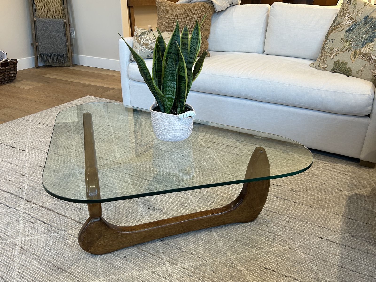 ZelleVintage mid-century modern coffee table. Circa: 1960. Crafted with a sculptural walnut-stained natural wood base and crowned with a thick, triangular-shaped glass top. Measures 47" wide x 31" deep x 13" high. This stunning table will add artistic value and beauty to your home! $200
