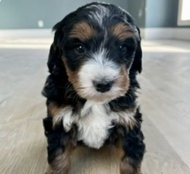RUBY: is a beautiful Mini Bernedoodle who will be full grown at approximately 25–35 pounds, making her the perfect medium size for both companionship and convenience. She has a loving, loyal temperament and truly thrives on being close to her people whether you’re relaxing at home, running errands, or enjoying time outdoors, Ruby will happily be right by your side. She is fully crate trained and is doing great with house training, making her an easy addition to any home. With her affectionate nature and gentle personality Berndoodles are a favorite in the doodle world.