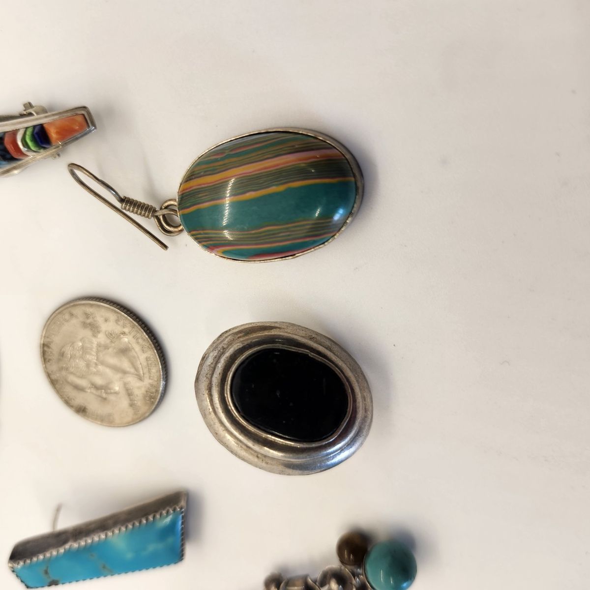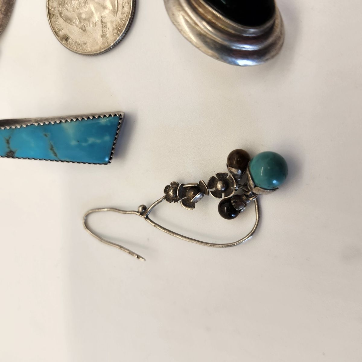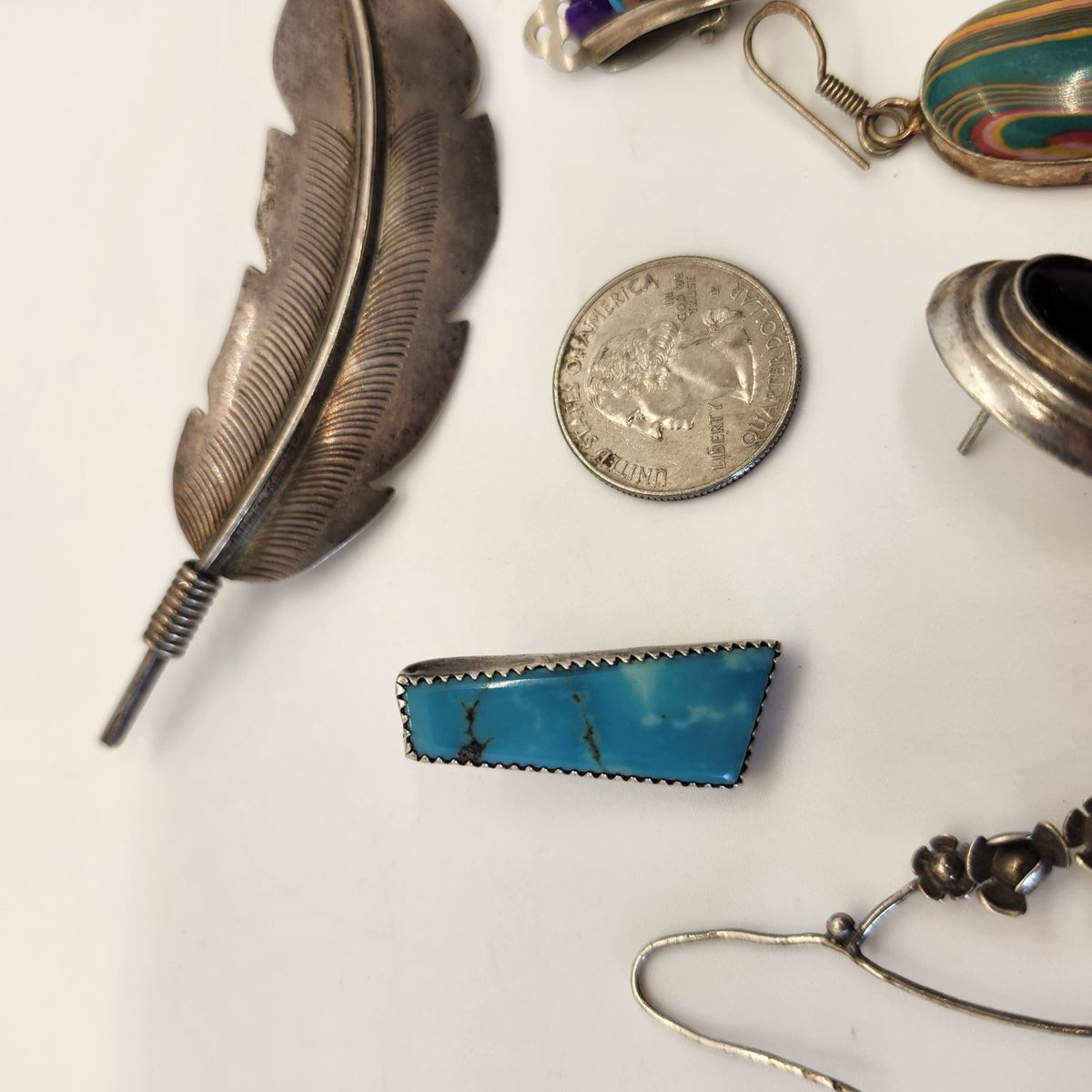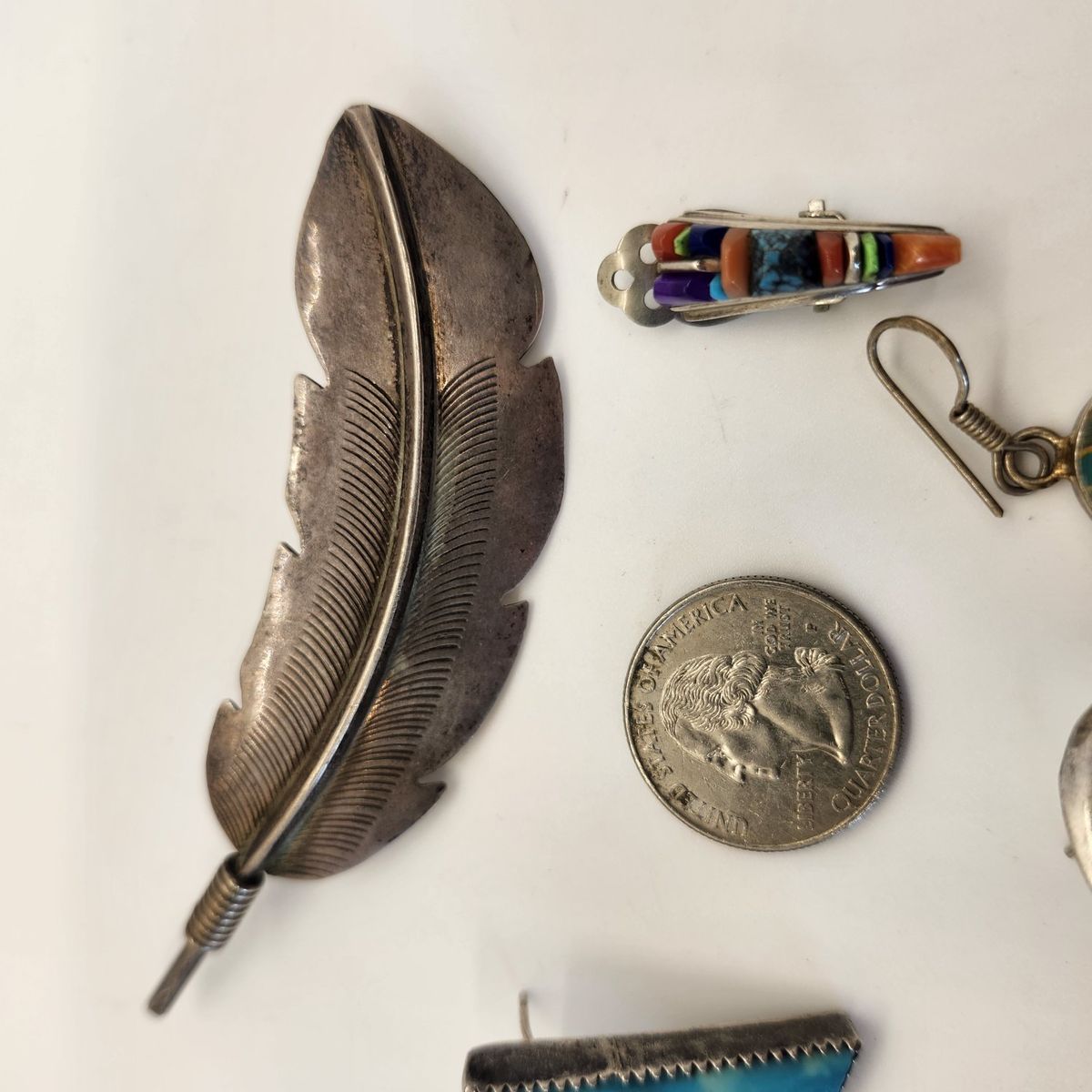 ZelleLot of sterling pieces. The earrings are singles, but the large sizes are perfect for pendants. Especially the turquoise. Some are signed. The feather is a Navajo hat pin/brooch. Pick up is in Midvale. Shipping also available.