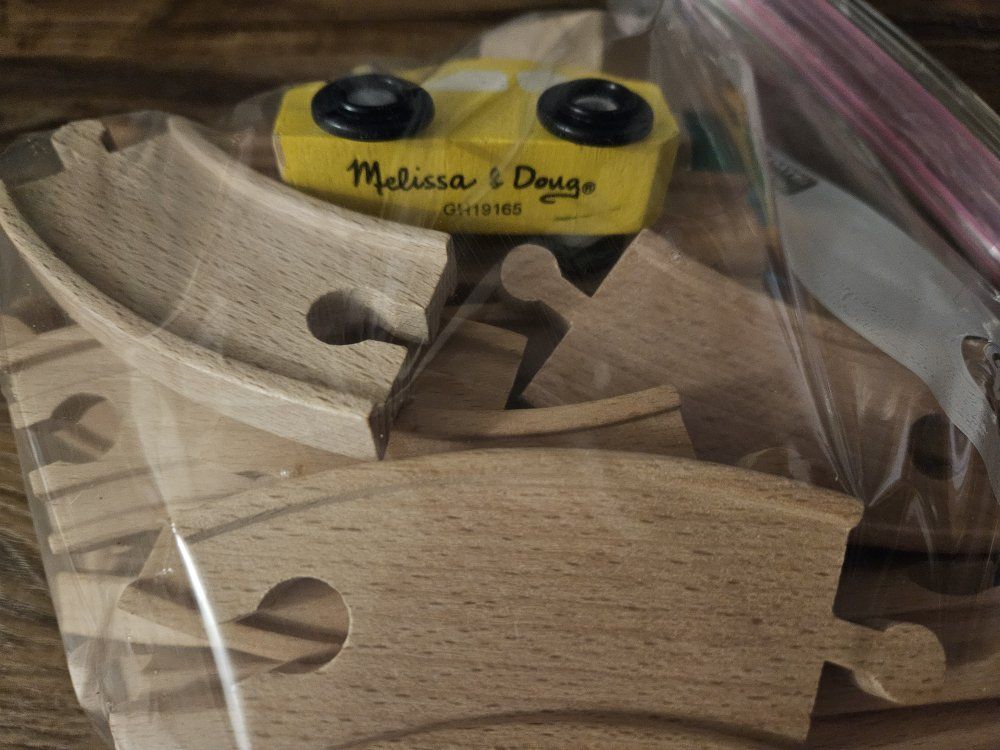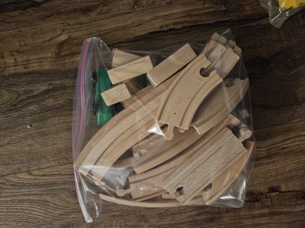 Venmo1 gallon bag full of car/train tracks and 2 painted wood cars. straight tracks, curves, inclines and supports.