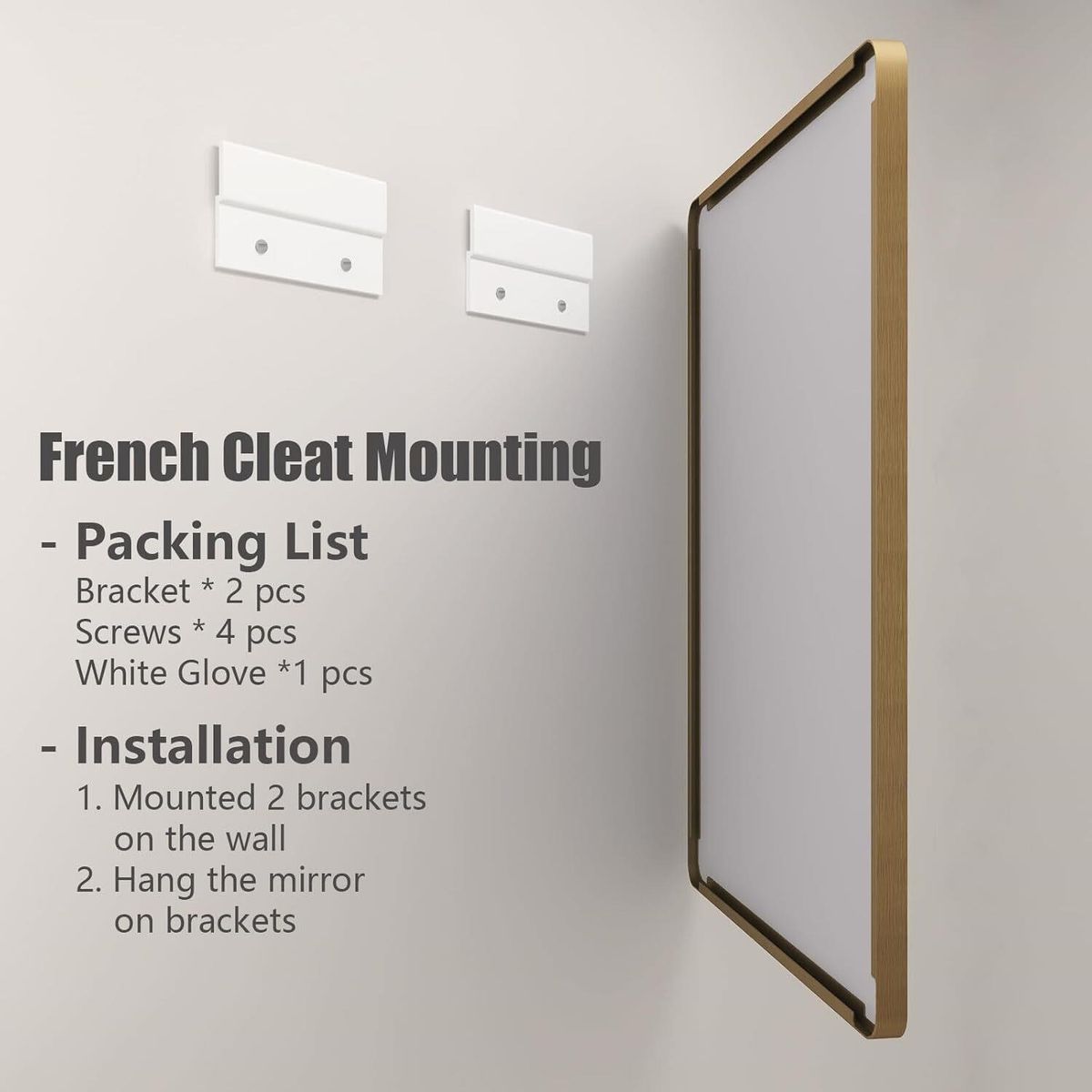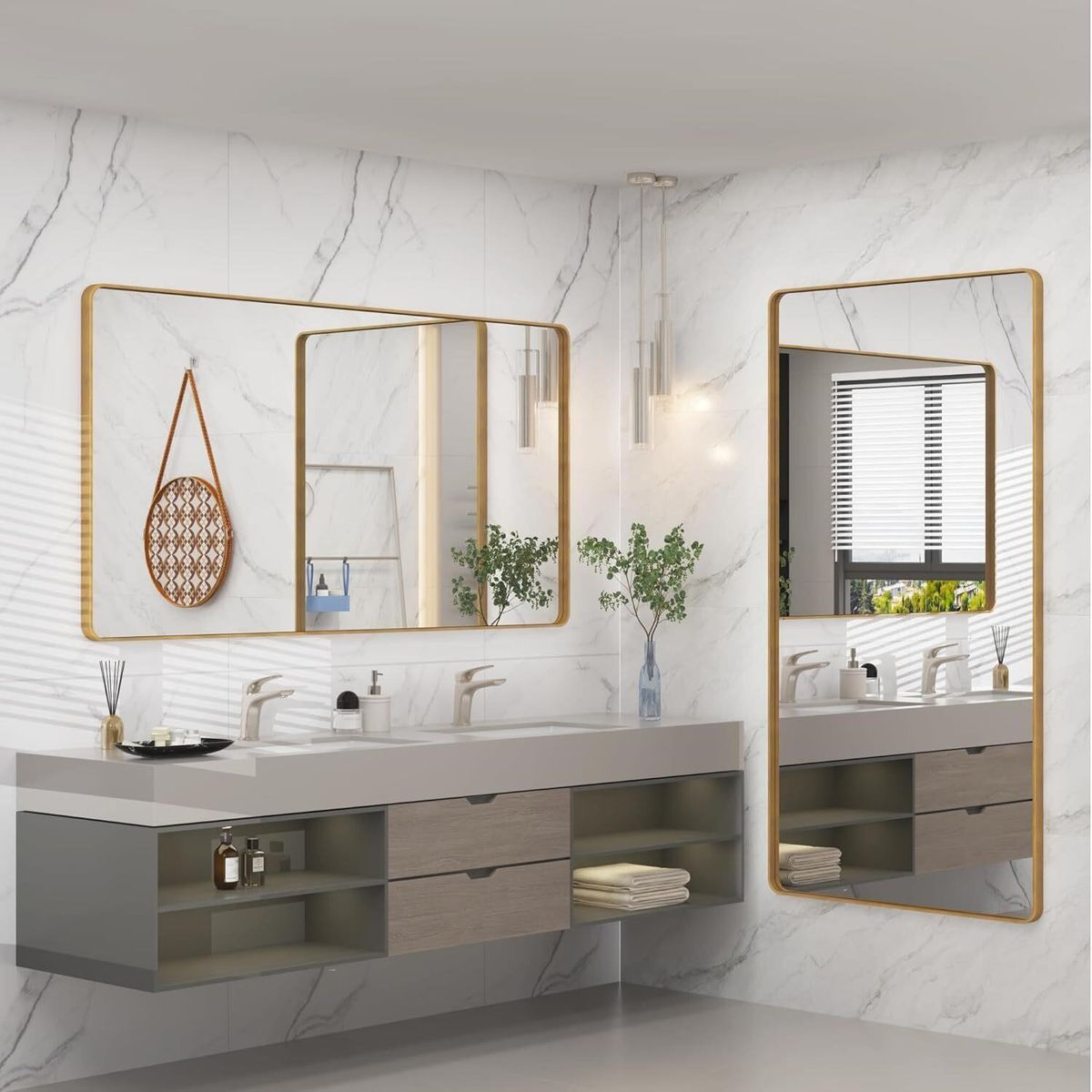 Durable Brushed Brass Gold Frame Mirror With round corner metal frame, CHARMOR gold bathroom mirror looks elegant and feels smooth. The frame material is premium aluminum alloy with brushed texture, which is stylish and more durable. Light weight, good corrosion resistance and wear resistance. Easy to hang. Shatterproof Tempered Glass Unlike other fragile mirrors, all CHARMOR metal framed mirrors are made of 4mm tempered glass which is shatterproof and 5 times sturdier than ordinary mirrors. No harm as it will not splash into pieces when it's broken. High Definition Glass All CHAMROR gold vanity mirrors are designed with high quality HD tempered glass. It presents an extra clear reflection image to show your beauty. Suitable for various home scenarios, like cloakroom, dressing room, powder room and so on. Vertical or Horizontal Installation. No need to align small holes like other mirrors. Fix the "Z" brackets on the wall first and then hang the mirror on it like hanging a picture. CHARMOR bathroom wall mirror can be mounted horizontally or vertically. Mounting hardware included. Impressive Package The packing protects the mirror completely. We are committed to providing safe and all-round protection of the mirror packaging to ensure that the mirror is delivered to the customer intact.