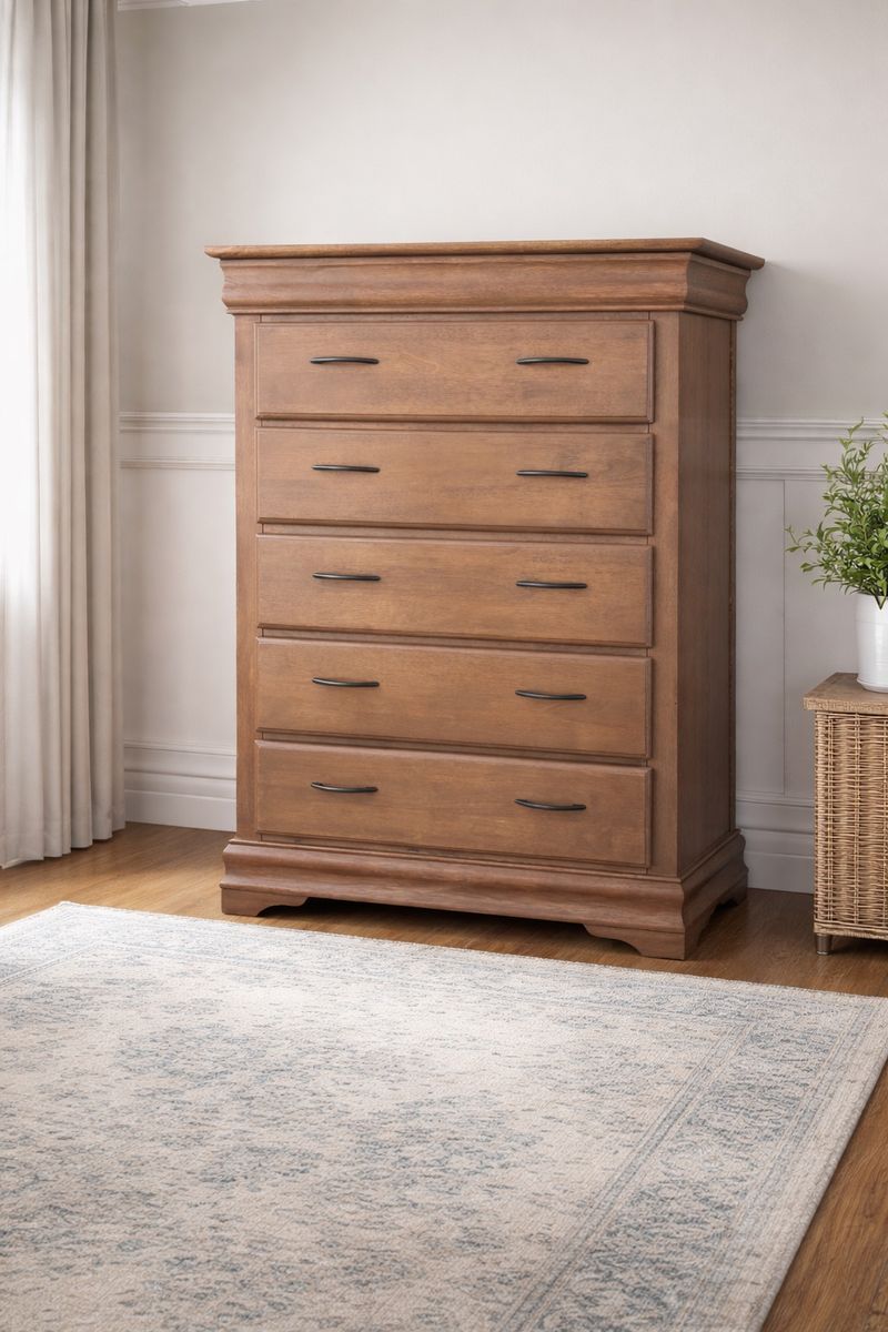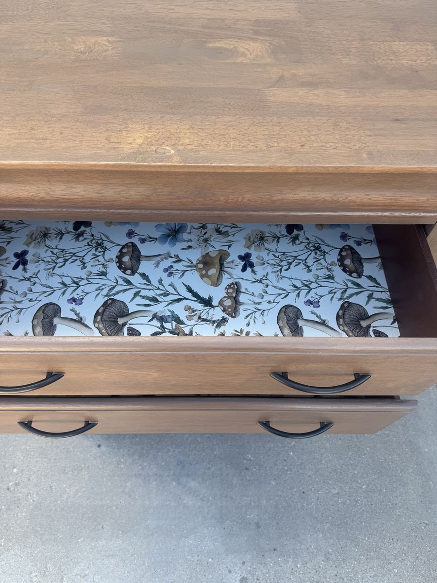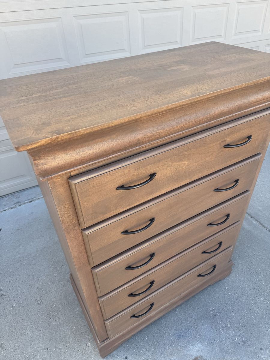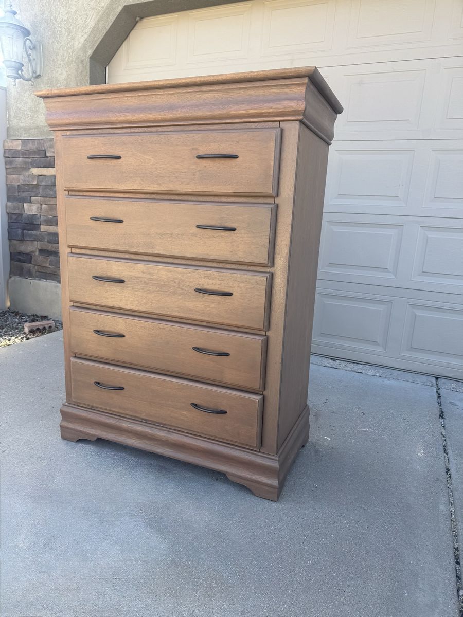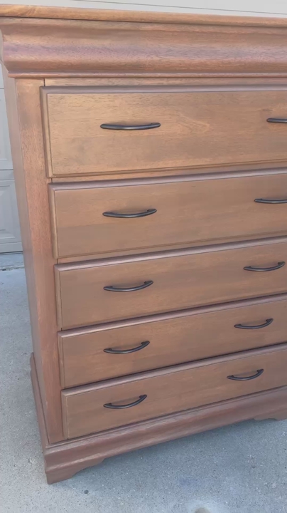 ZelleCustom natural Oak finish that you will only find in high end furniture stores ranging from $1000-$2000. Comparable to pottery barn or magnolia in color and style. All drawers are working perfectly, freshly lined with new drawer liner. Measurements are 40inches wide 54inches high 20inches deep