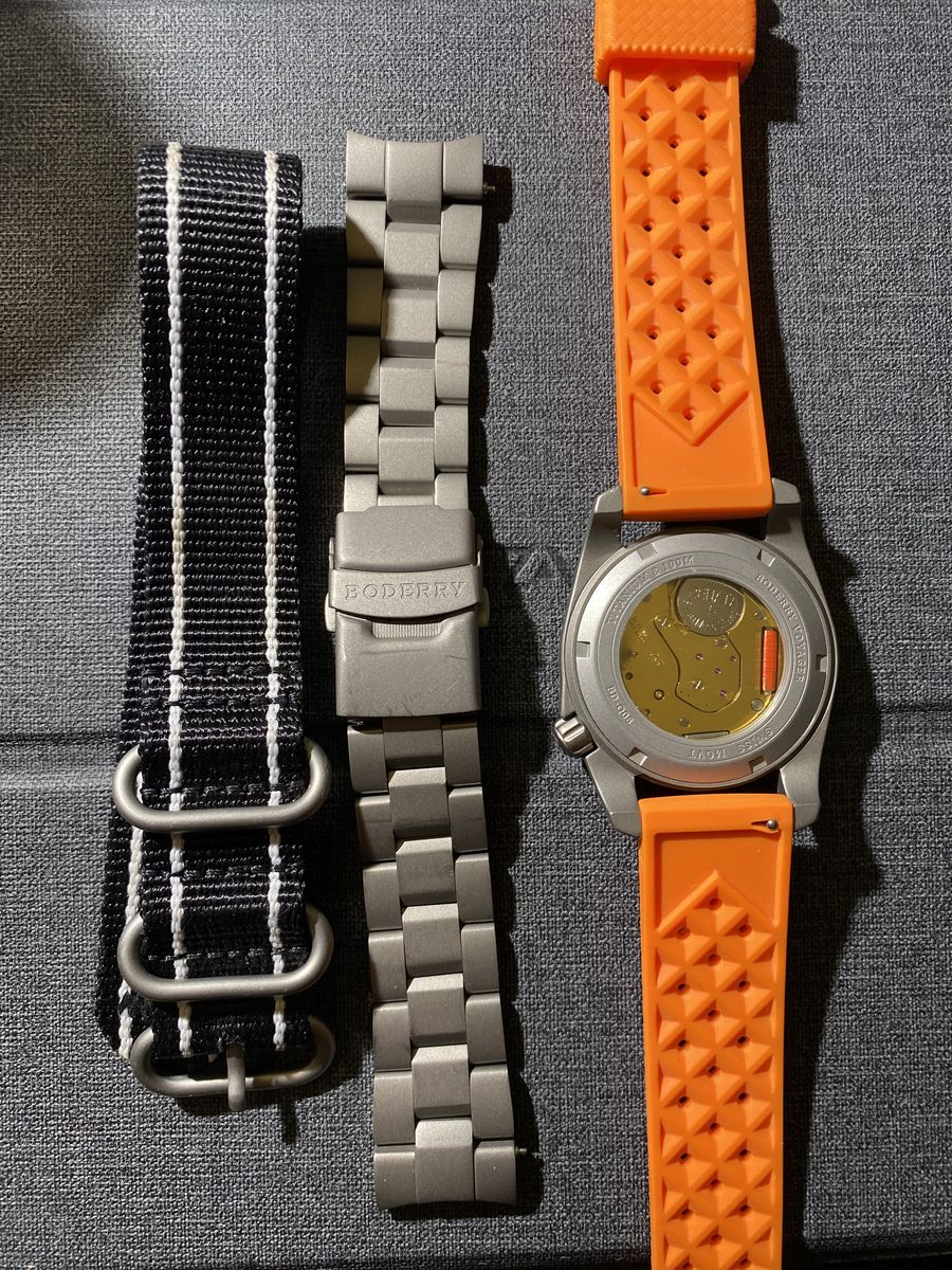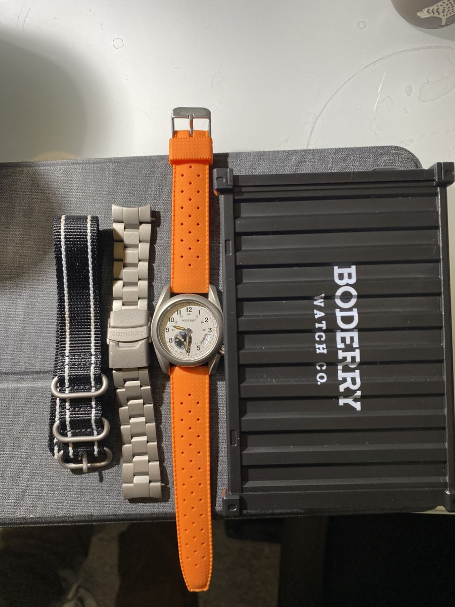 VenmoComes with original box + warranty, and extra straps as pictured (Black NATO, orange tropic, sandblasted titanium bracelet) moderate scratches on the bezel and bracelet. No scratches on the crystal, and no issues with the movement (uses a Swiss ronda quartz)