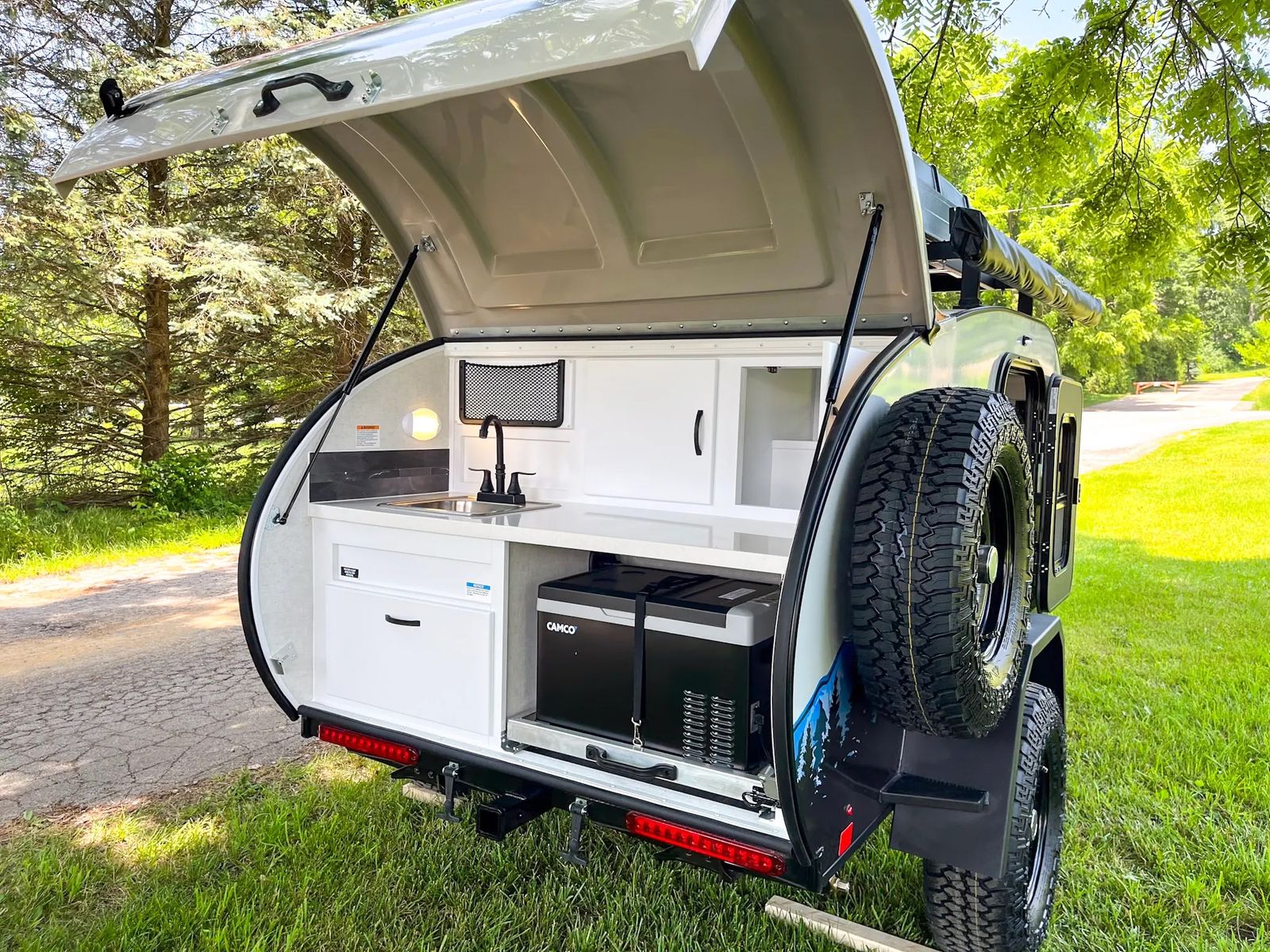 This 12LRK is still brand new, it still smells brand new. I bought it last year off the lot and used it only 3 times. It has always been garage kept. I am moving and it cannot go. I put on the overland 180 awning, it free stands without polls, and is huge. Solar, satelite, running water/sink in the back, outdoor shower, and a fridge that can blue tooth to your phone. The trailer has enough clearance to take anywhere off-road, and electric brakes. It has air conditioning, and even a fireplace for heat. The bed can be turned into a couch with a table that pops up from the floor. It has a battery cut off for when you are storing it.