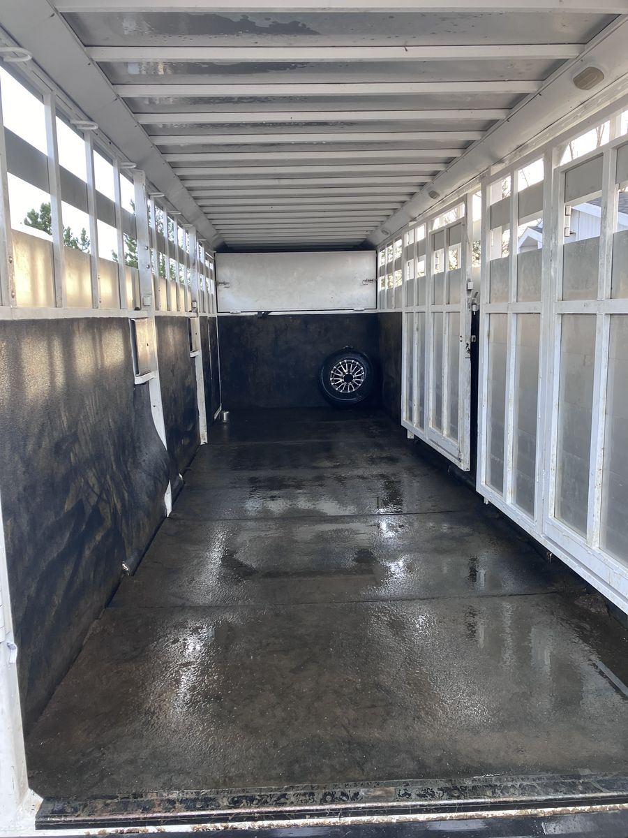Has two dividers, with slide gates rear gate has a slide gate as well. They are all slam gates. All of them shut and open easily. Comes with a Bigfoot hydraulic jack makes for easy loading and unloading. Has escape door on one side. Tires are good 14 ply’s and have 50% tread left. 9 tie rings on the inside for horses And several on the outside. No paw marks on the outside 2 brand new 7k torsion axles underneath it with easy grease zerks that fill both front and back bearings.