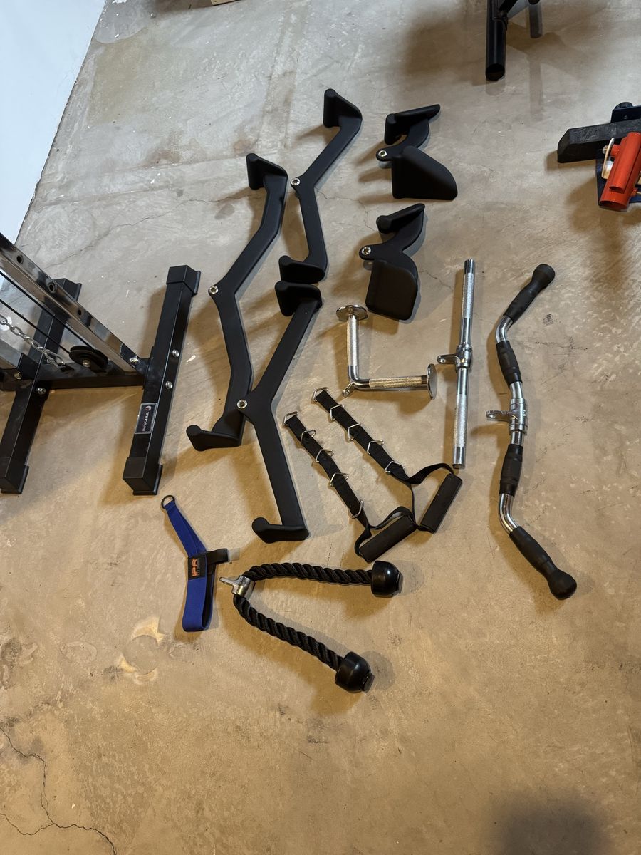 Comes with a ton of accessories. multiple pulldown bars, two row handles, tricep rope, tricep straight bar, v bar, handles, and ankle/foot strap