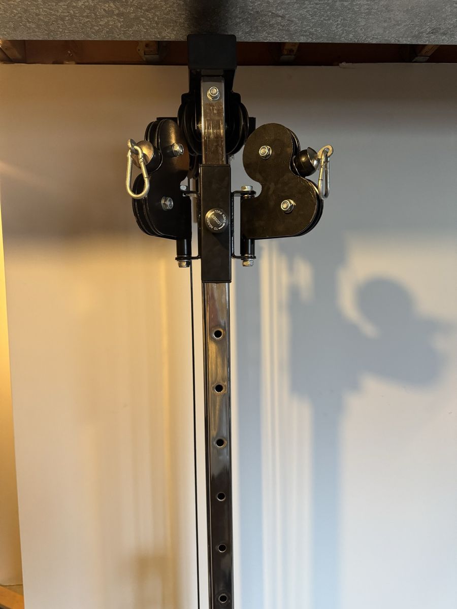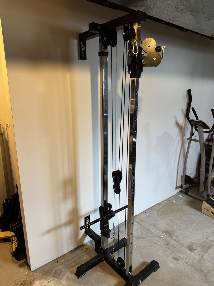 ZelleTitan fitness 80” pulley tower. Plate loaded up to 350lbs 2:1 ratio when using a single side, 1:1 with both