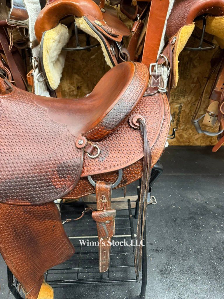 This saddle features a 16" hard seat, 6 1/2" gullet, QH bars, rawhide wrapped wood tree, post horn with leather rope strap, round skirt, 4 long leather ties, pre-twisted stirrups, back cinch, new front cinch, fleece is great, and weight is around 36lbs.