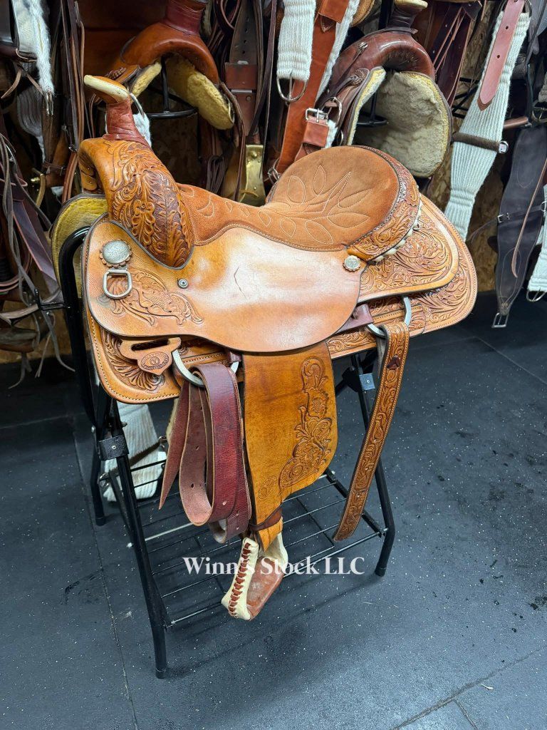 This saddle features a 15.5" padded suede seat, 6 3/4" gullet, SQH bars, dees on back conchos for leather ties if needed, stainless rigging, rawhide wrapped stirrups, fleece is good, and weight is around 35lbs.