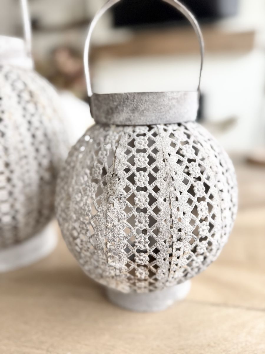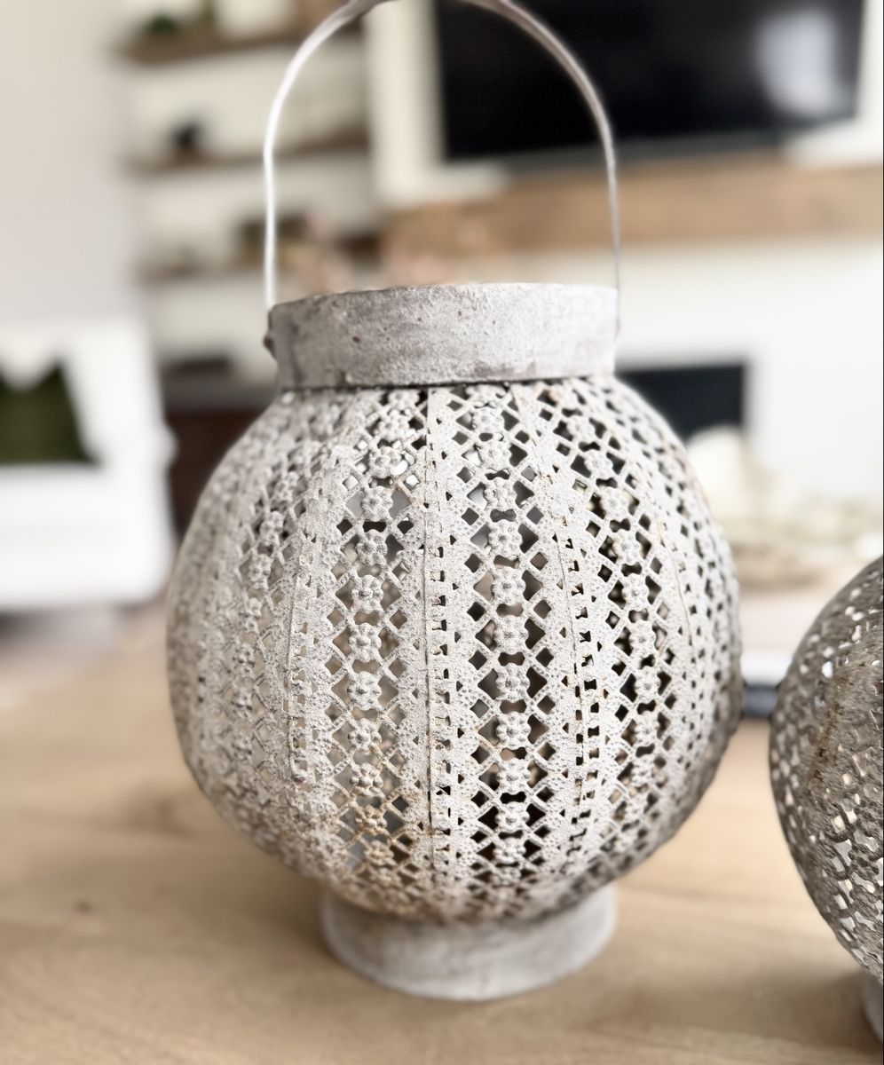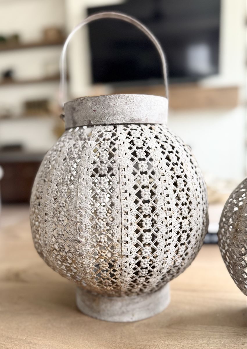 Beautiful | Rustic | Style | Metal | Distressed | Round | Lanterns | Home Decor | Staging | Living Room | Shelves | Console Table | Coffee Table | Bookcase | Front Porch | Fireplace Mantle | Home Accents | Home Staging | Vintage | Aged | Look | Rustic Charm | Character | Grey Metal | Floral | Candle Holder | Tablescape | Dining Table Decor | Unique Lanterns | Handles