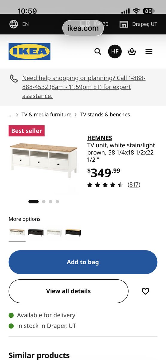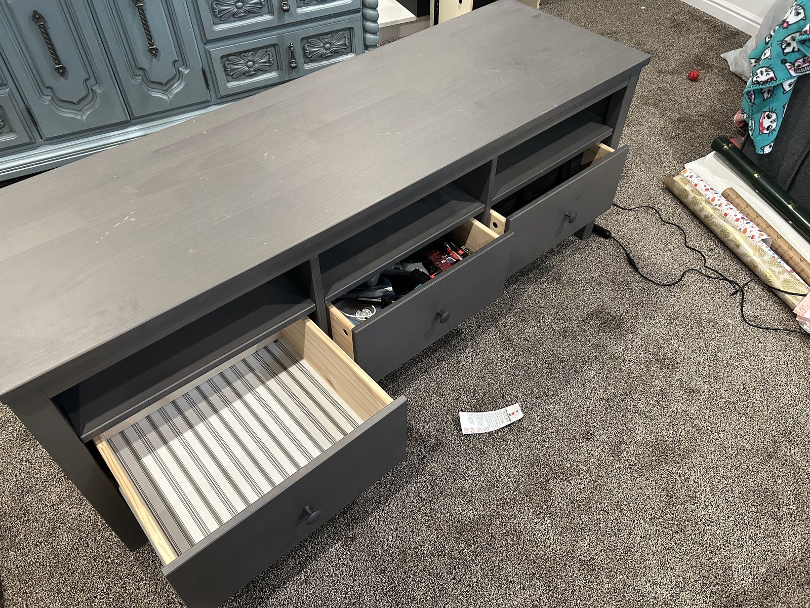 VenmoHEMNES IKEA TV stand. The color on this one is a beautiful brown/grey color. There is a little damage/wear on the top surface.