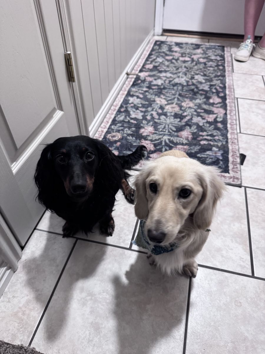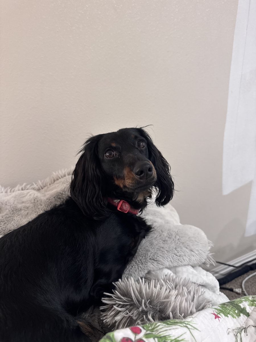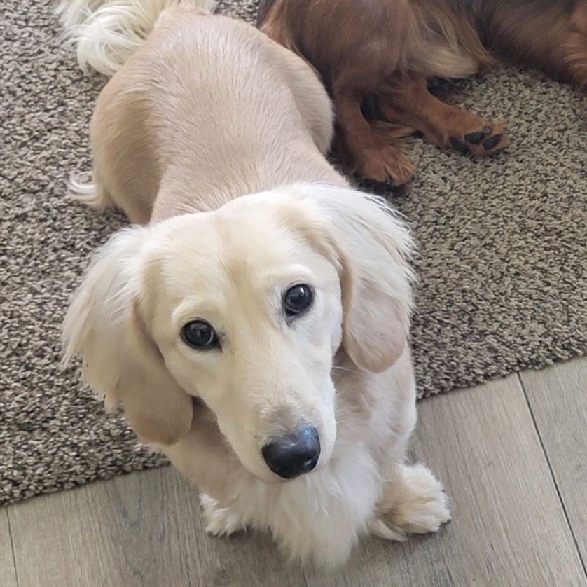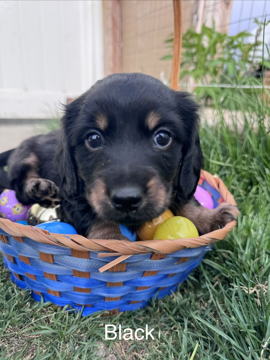 Parents: Sire: Long haired blonde dachshund Dam: Long haired black and tan dachshund