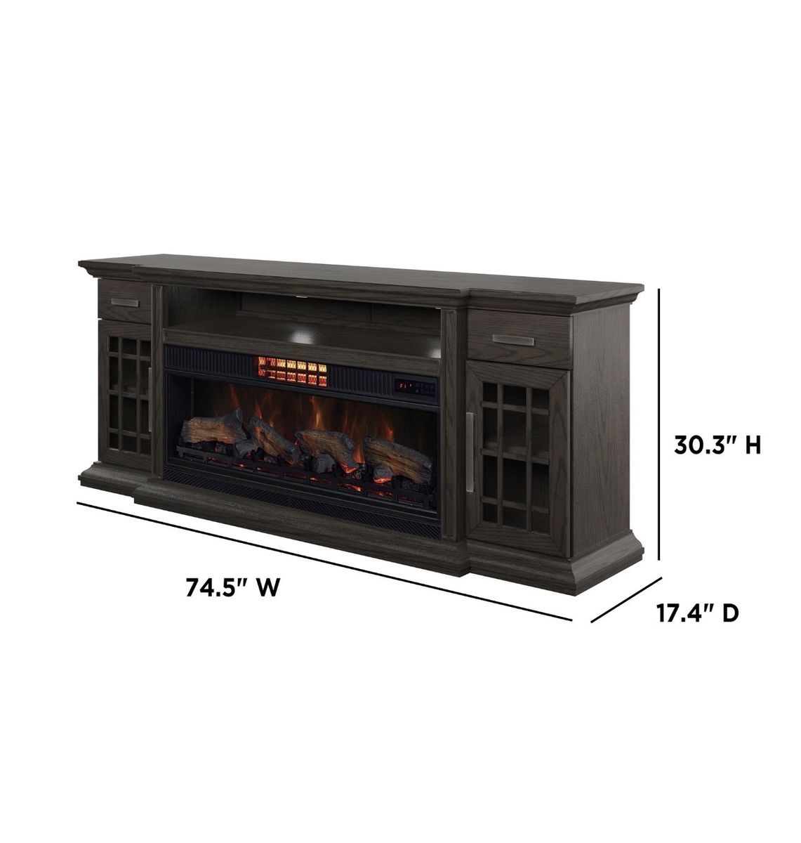 Items: 1 Console, 1 Fireplace Insert Accessories: 1 Remote Control 2 Anti-Tip Brackets Overall Dimensions: 74.6" W x 17.4" D x 30.4" H Weight: 178.2 Lbs. Load Capacities: Top: 90 Lbs. Middle Drawer: 45 Lbs. Side Drawers: 5 Lbs. Shelves: 20 Lbs.