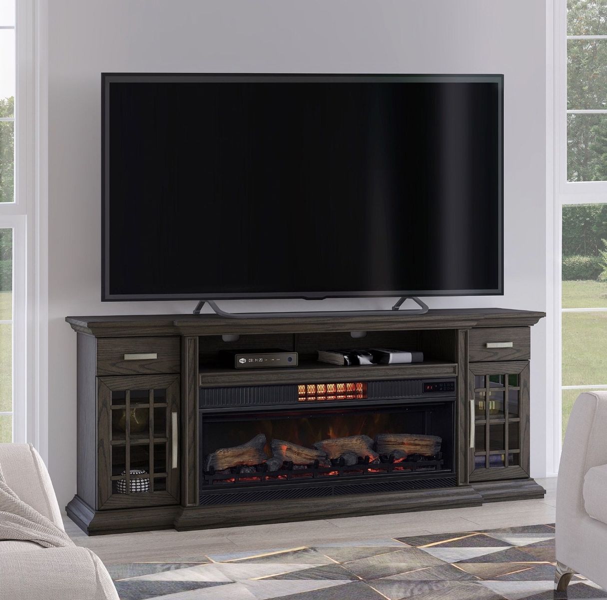 Supports Most Flat Screen TVs up to 80 in. and 90 lbs • CoolGlow 2-in-1 Heater and Fan for Year-Round Comfort • Provides Supplemental Heat for up to 1,000 sq ft • Patented Safer Plug Fire Prevention Technology • Storage Including Two Full Extension, Slow-Close Drawers
