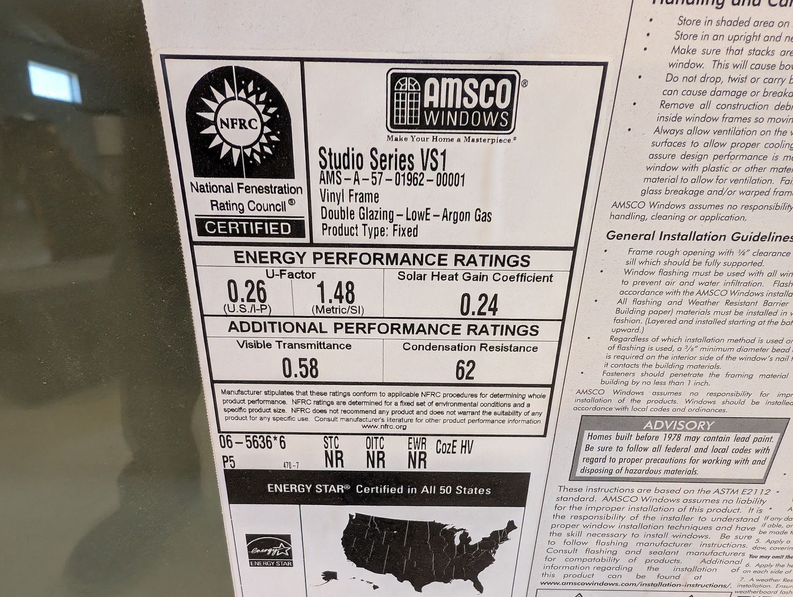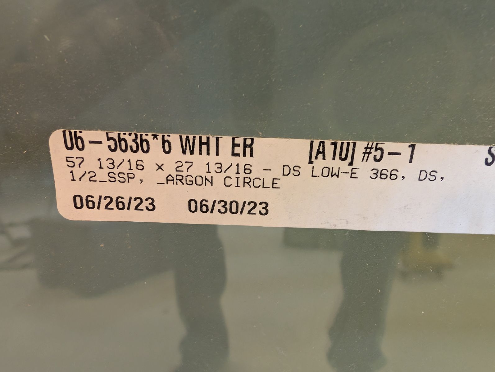 Received wrong size window! Sticker size: 57 13/16 x 27 13/16. DS LOW-E glass. Argon for great insulation factor. Double glazing. Fixed (non operable). See sticker on the Energy Performance. Use for a cabin, a garage, shed, or shop, where you can frame around it and fit for your own use! Only $50. Cash only, please.