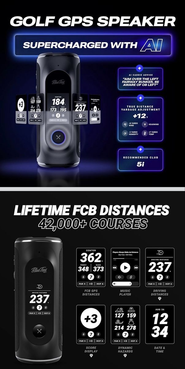 VenmoBlue Tees Golf Player+ AI-Powered GPS Speaker - Touchscreen Display, 10+ Hour Battery, 42,000+ Courses, Visual & Audible Distances, Hazard Detection, IPX7 Waterproof.
