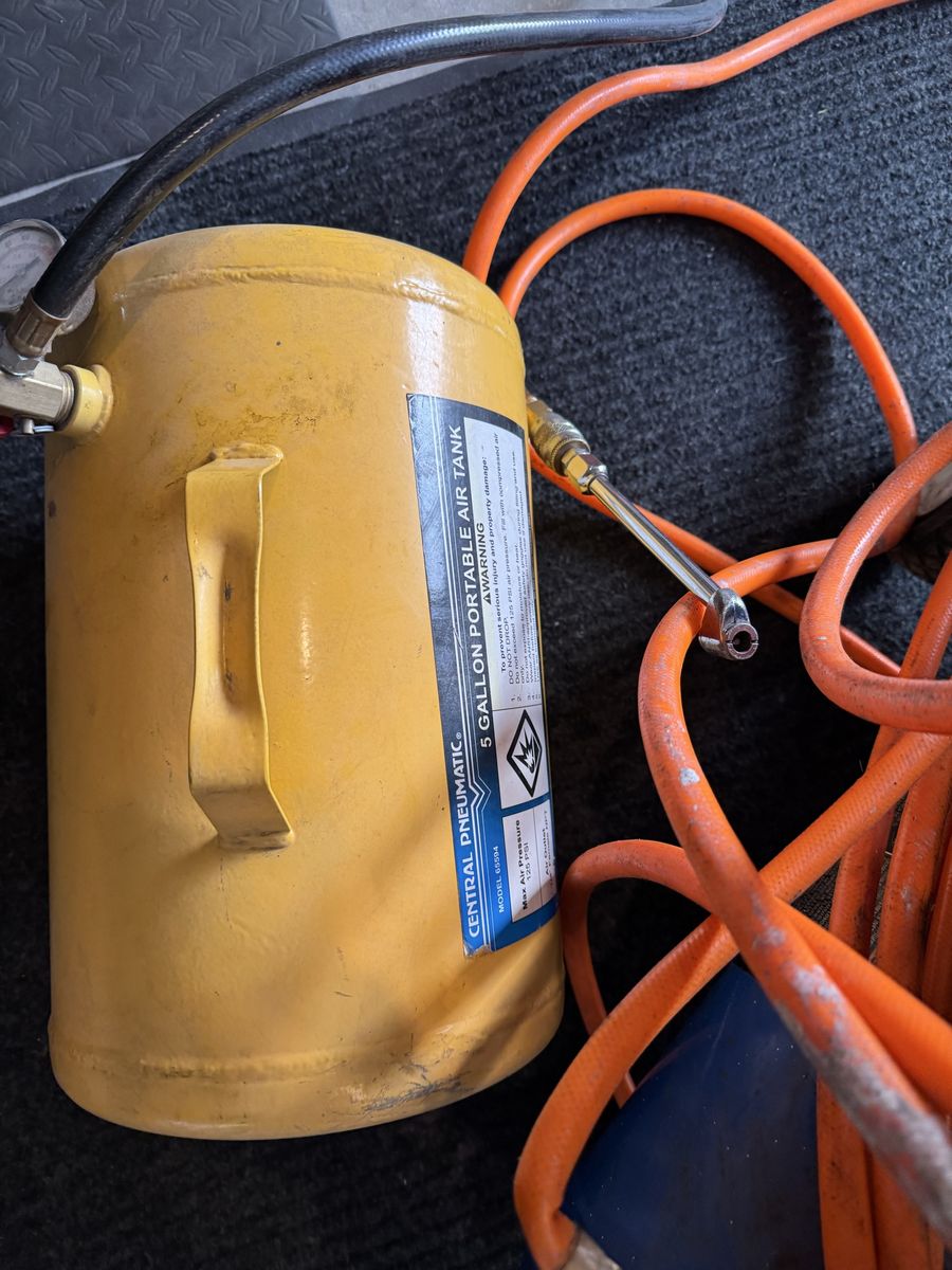 2 HP 7 gallon compressor with extra 5 gallon tank. Used to air up my motorcycle tires and for cars. Its awesome.