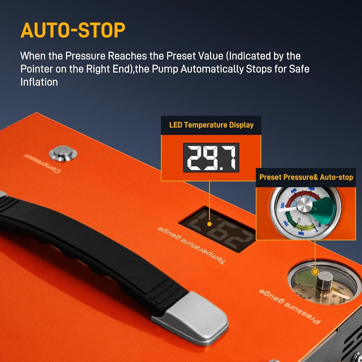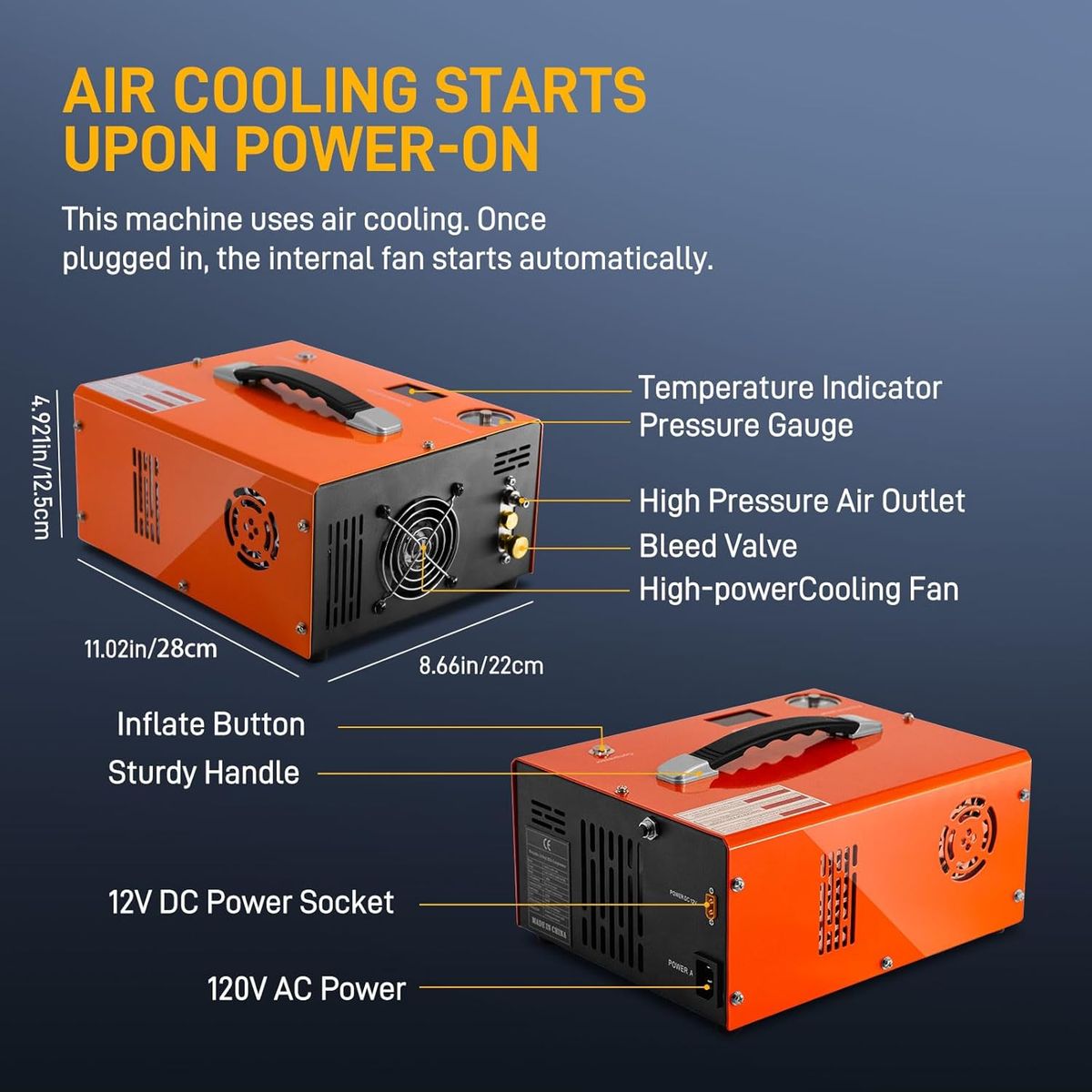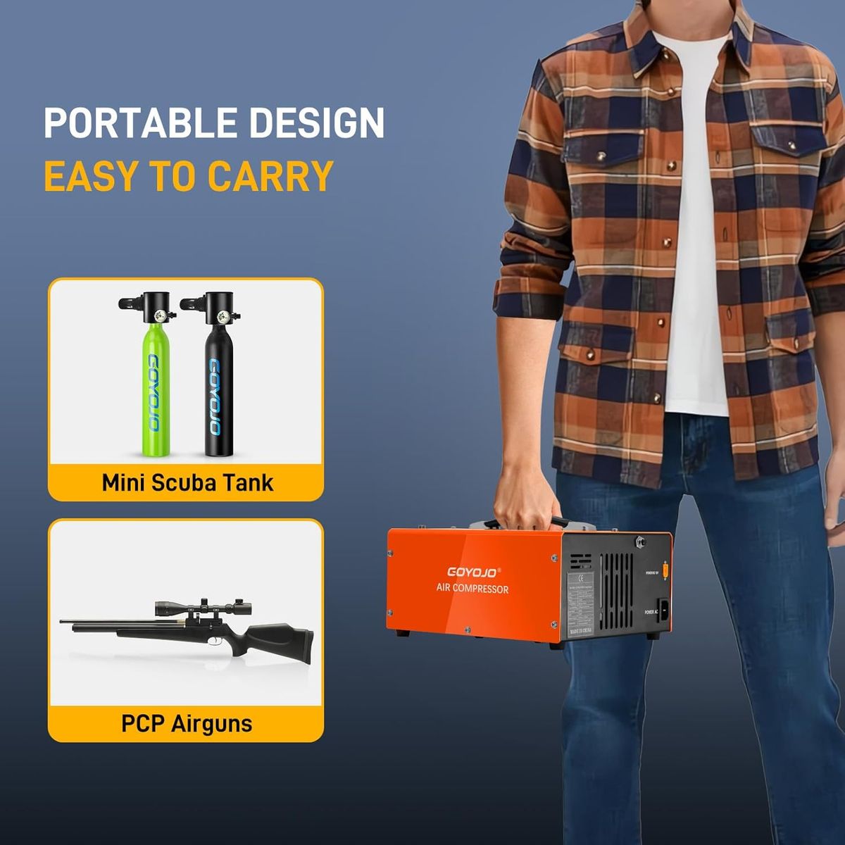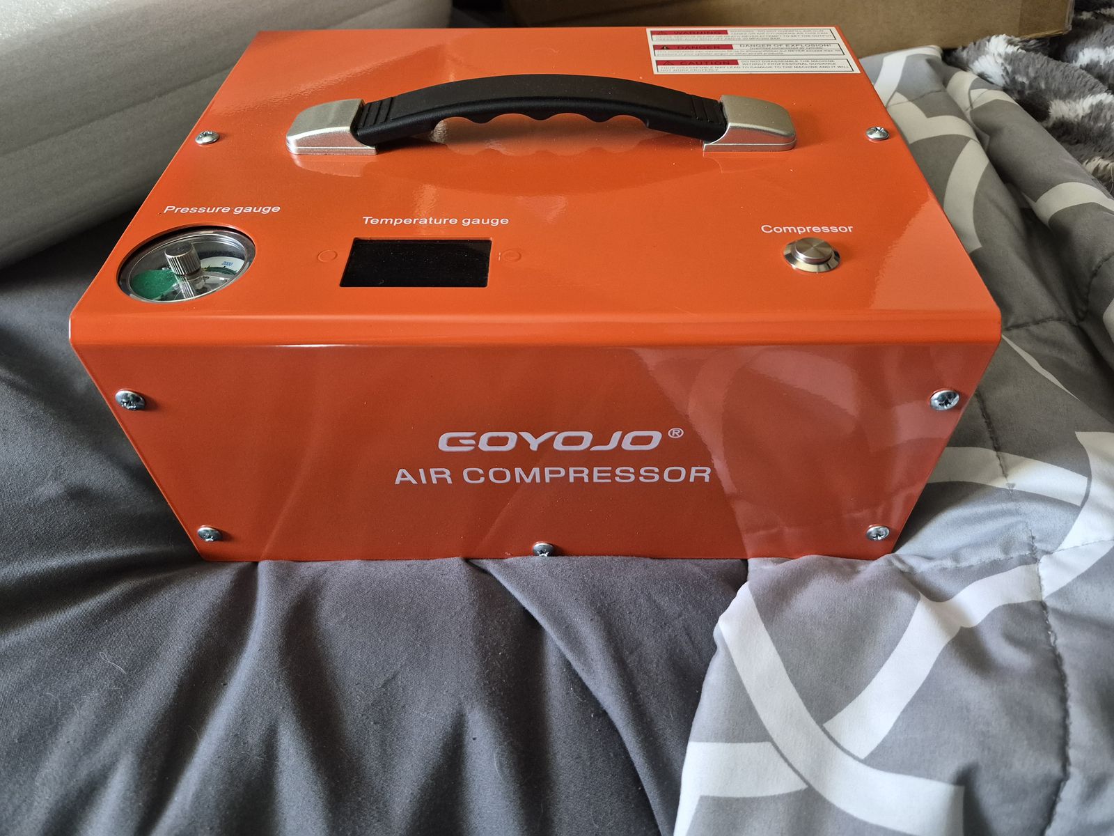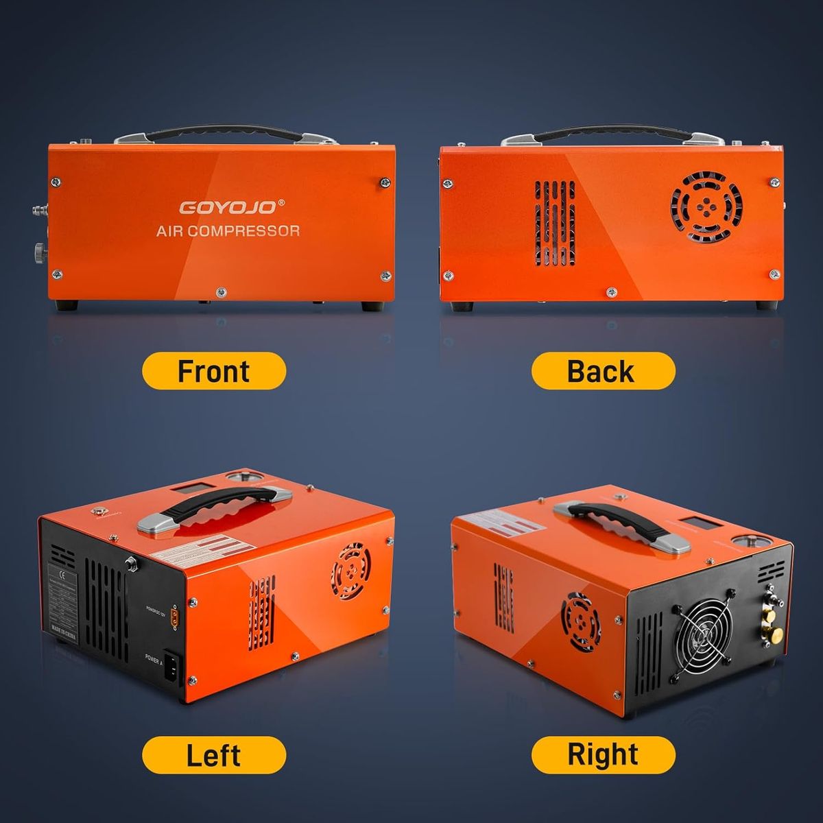 Brand GOYOJO Voltage 120 Volts (AC) Recommended Uses For Product HPA Tanks, Mini Scuba Tank, PCP Airgun, Paintball Gear Power Source 12V DC or 110V/220V AC Noise Level 70 Decibels Special Feature AC & DC Adaptable, Automatic Shut-Off, Built-In Gauge, Oil-Free Pump, Portable VERSATILE & BEGINNER-FRIENDLY – Designed with ease of use in mind, the GOYOJO 4500 PSI Pcp Air Compressor is the ideal entry-level choice for hobbyists and outdoor enthusiasts. From inflating PCP airguns to topping off mini dive tanks and other small high-pressure gear, this compact unit delivers dependable performance across a wide range of applications. SAFER & RELIABLE – GOYOJO Pcp Air Compressor’s integrated transformer design streamlines power delivery, eliminating an extra adapter. You gain a safer, all‑in‑one solution that’s easier to transport, setup, and store. PRECISION AUTO STOP – Set desired PSI (up to 4500) and let the air compressor shut off automatically—perfect for airrifle, pcp airguns, and paintball gear. FAST FILL – Capable of filling a 0.5L (500cc) tank from 0 to 3000 PSI in approximately 15 minutes—ideal for quick refills before diving or shooting sessions. Recommended for inflation capacity under 1L (1000cc) Dual Power Design – The GOYOJO PCP Air Pump runs on 12V DC from a car battery (with included alligator clip cable) or standard 115V/230V AC from a household outlet. A voltage selector switch on the bottom of the unit lets you choose the correct setting (factory default: 115V), making it ideal for use at home, in the garage, at dive sites, or in remote locations. HEAVY DUTY BUILD – Durable steel frame and oil-free pump for low maintenance. Includes LED pressure display and universal 8mm quick-connect fittings. ACTIVE AIR COOLING SYSTEM – Built-in fan activates when powered to prevent overheating (note: fan noise during operation). ️ NOTE: Releasing the bleed valve is essential after each use to safely discharge pressure. A small amount of water mist may appear during this process due to the sudden pressure drop causing moisture to condense — this is normal. ️ NOTE: Not suitable for inflating low-pressure inflatable items such as car tires, basketballs, air mattresses, or inflatable pools. This PCP air compressor also cannot be used to operate pneumatic tools such as air blow guns or air duster guns. WARRANTY: This product comes with a 1-year warranty. If you experience any issues, please feel free to contact us — we’re here to help. During the warranty period, we offer free replacement parts for any product-related problems.