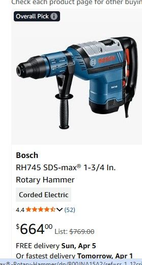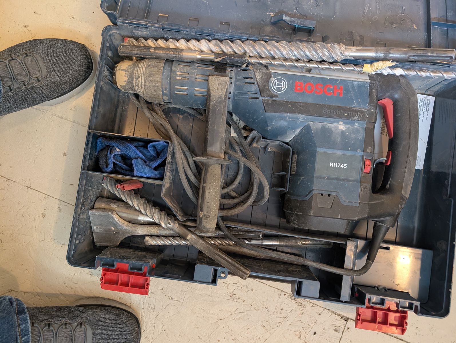 Hammer drill RH 745 with case and includes 4 Drill Bits and 2 chisel bits. See photo's for all contents. Heavy duty, industrial model. Corded. Amazon price is $664 without bits! Cash only please.