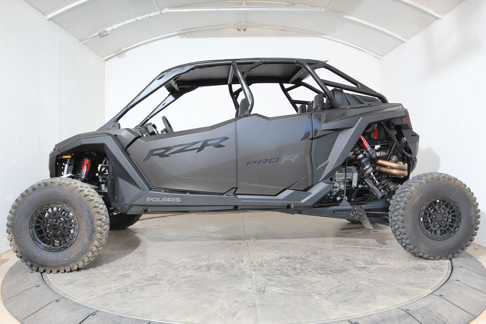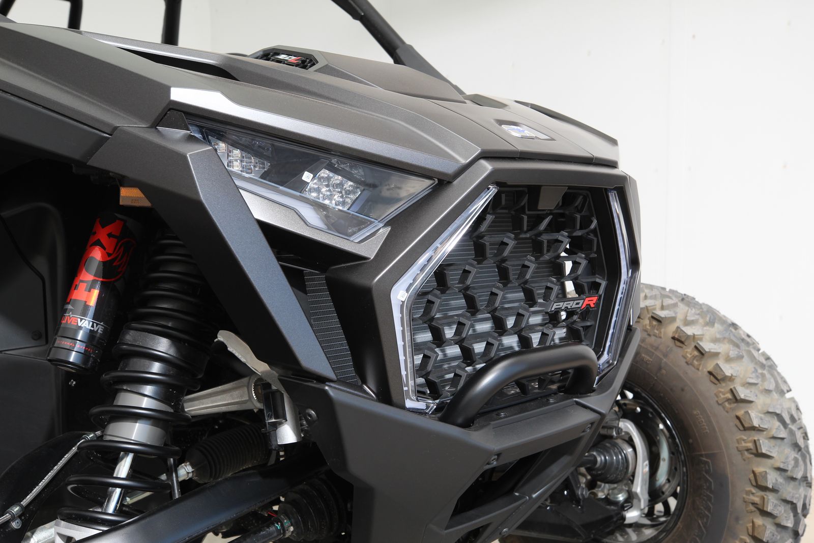 Up front, fresh air intakes help maintain cabin comfort while Pro Climate Heat & Vent seats make temperature control a breeze. New animated RZR Fang accent lighting adds an extra layer of visual swagger, and a painted front fascia and center hood give the Pro R a standout finish. The 5-lug color-matched beadlock wheels, along with FOX 3.0 Live Valve X2 internal bypass shocks and the DYNAMIX DV suspension system with four selectable ride modes, make sure this beast responds to terrain like nothing else out there.