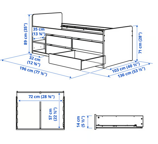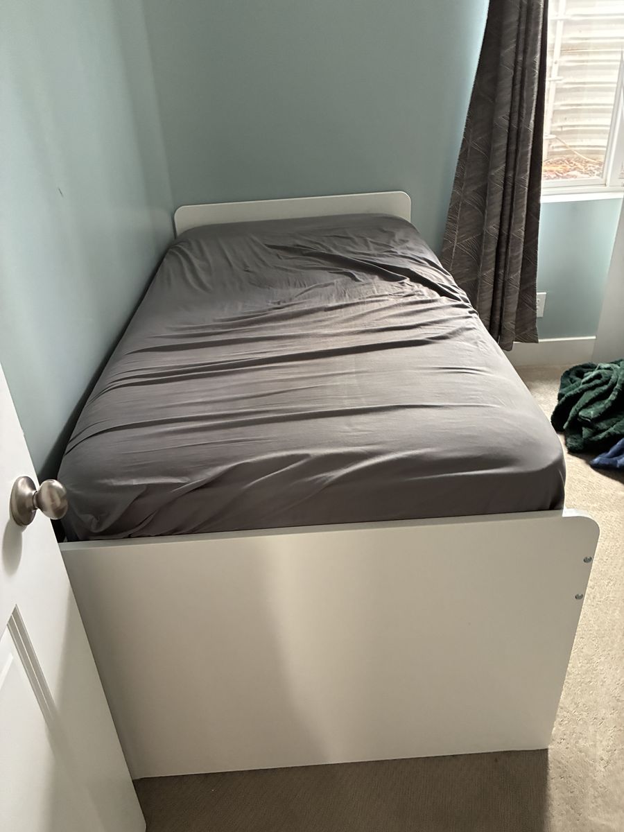 VenmoThis is a like new bed frame. It has been used only by an adult child and has minimal wear. It has four drawers for clothing and two cubby holes for other things like books. If you want the mattress it is yours. It has only been used for two years. It is an IKEA bed.