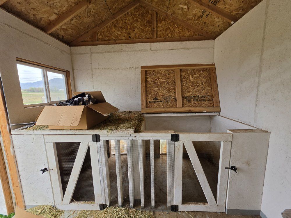 Built professionally January 2025. We will clean it out before it's sold. Whelping pens are about 5x4. walls are insulated, roof/ceiling is not but will come with the insulation rolls.
