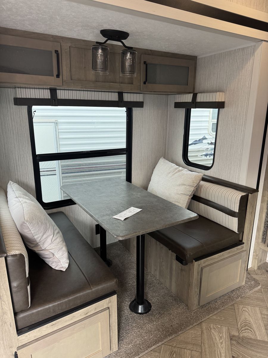 This wide-body fifth wheel features durable aluminum-framed laminated sidewalls and an easy set-up, making weekend trips or extended stays simple and stress-free. It comfortably sleeps up to 6 and offers a bright, beautiful interior with thoughtful design throughout.