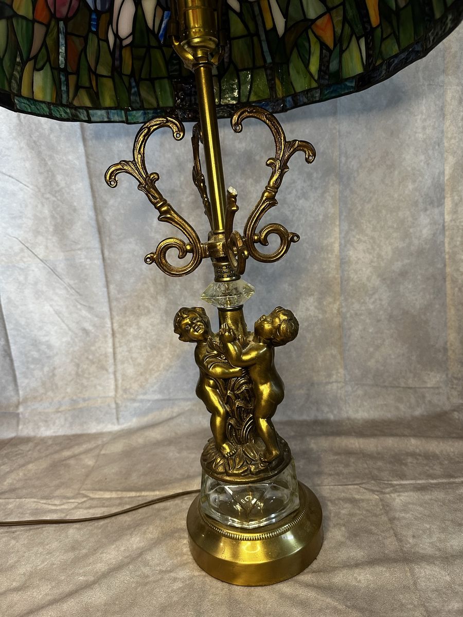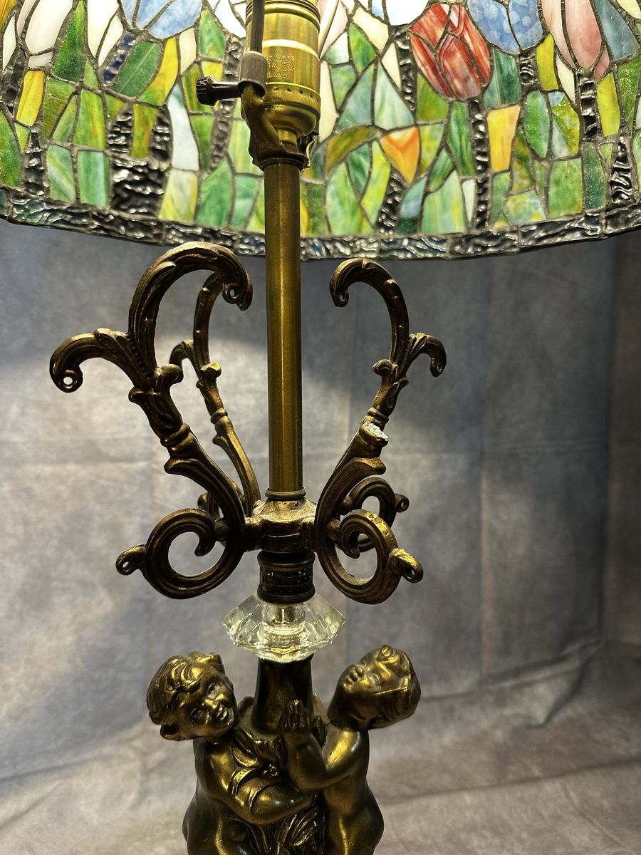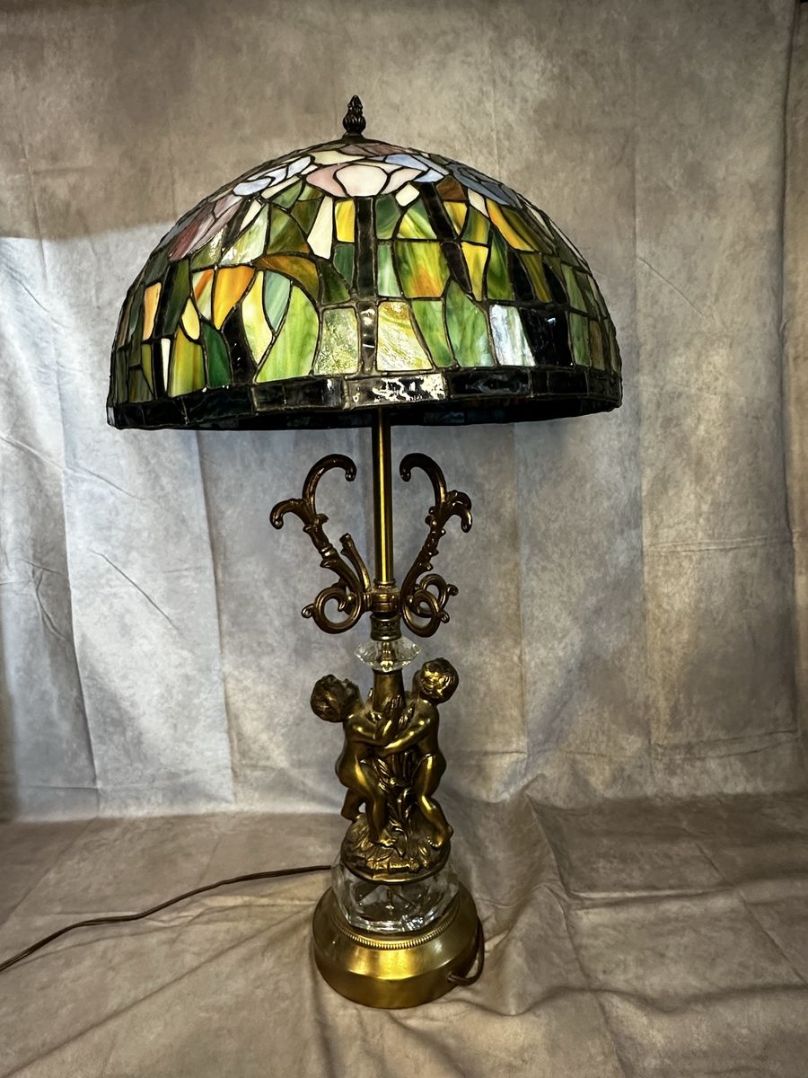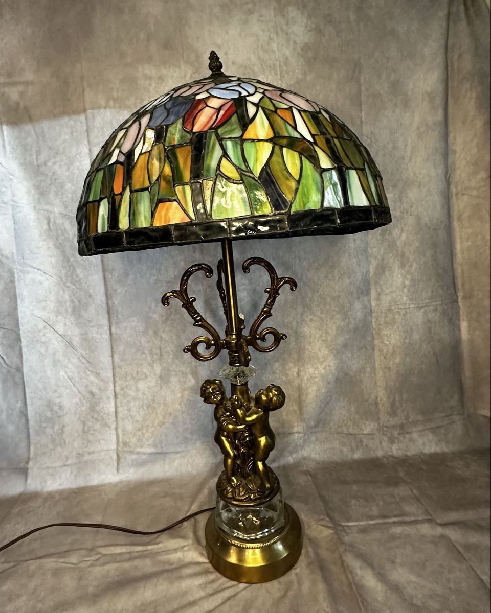 VenmoBeautiful Tiffany-style stained glass table lamp with colorful floral shade and ornate cherub base.