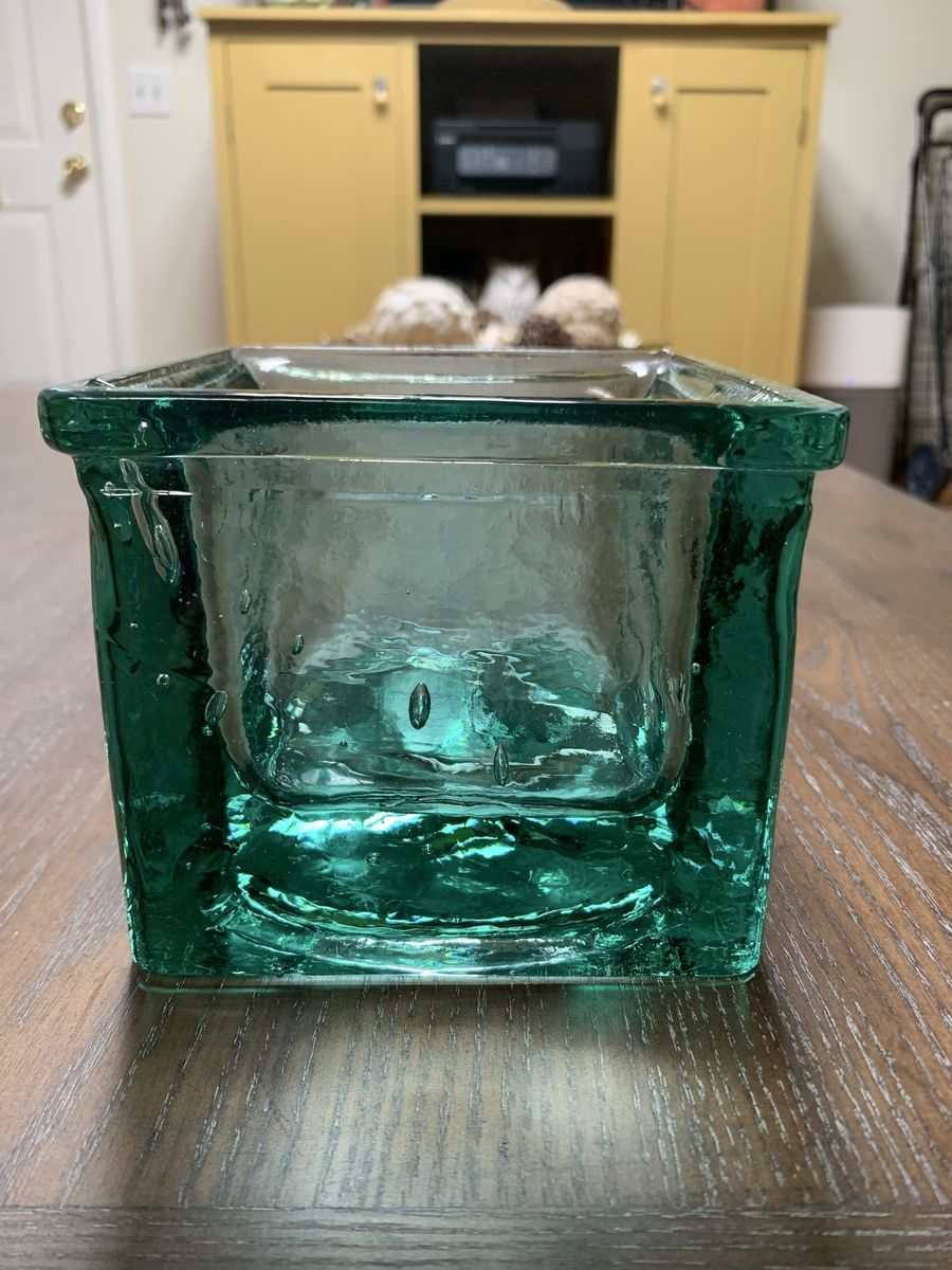 VenmoA stunning 5” glass vase or candle holder from Spain. A square block shape with a textured, ice-block design. Use as a vase, planter, or candle holder. Made of heavy, thick glass. Weighs 4lbs. Clean. Venmo to hold. Non-smoking/No pet home.