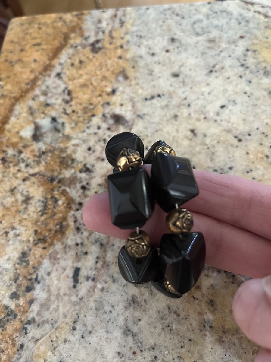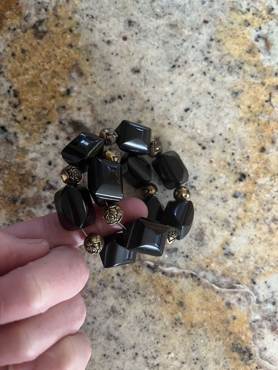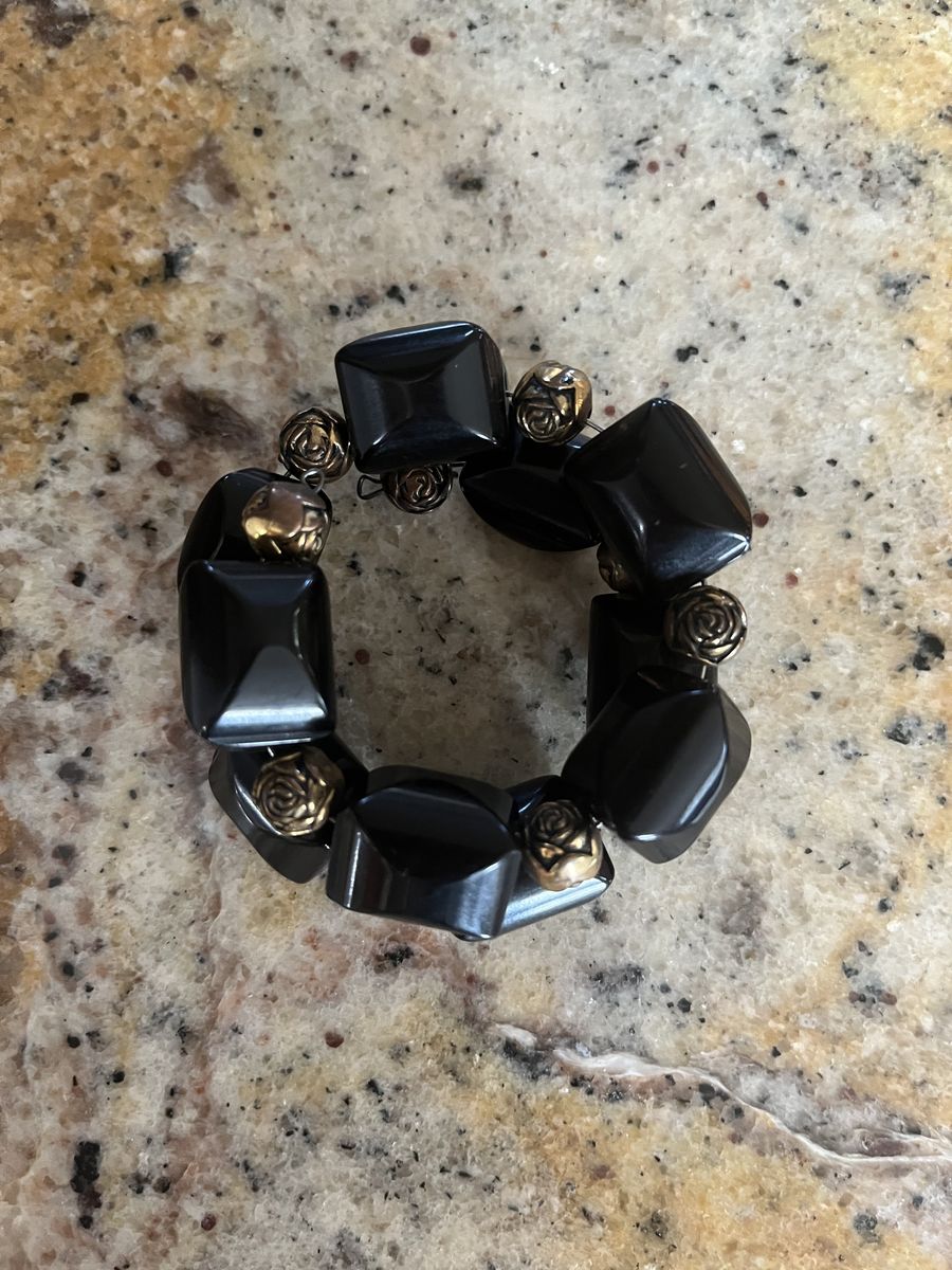 VenmoWhat a stunning curled wire black glass bracelet this is! This has gold colored rose beads in between the black beads. It is a classic bracelet. This is in good condition. Selling to help a parent. Price is firm.