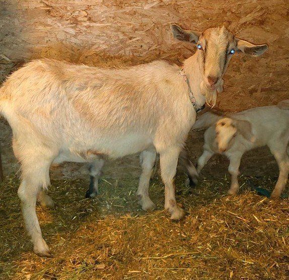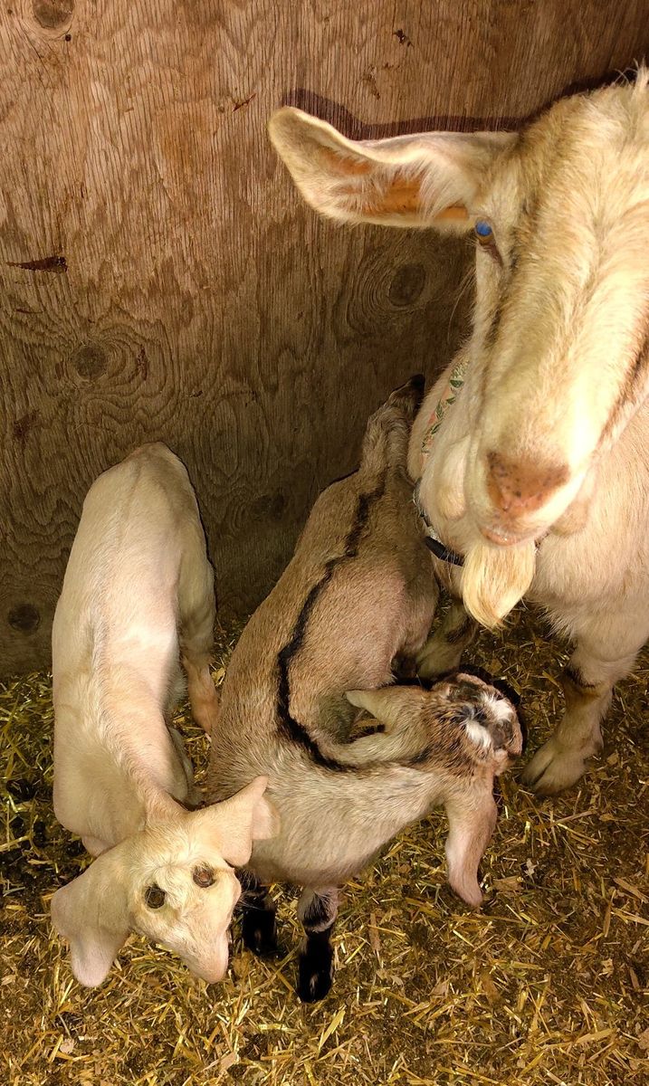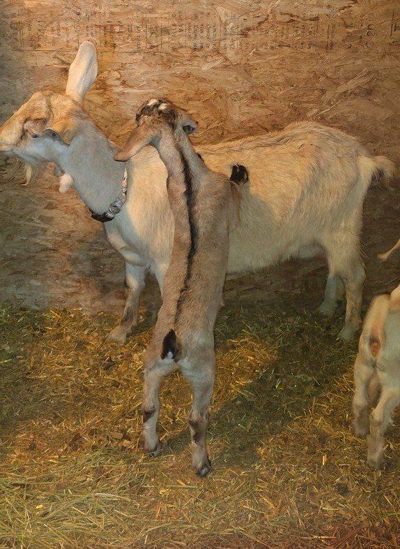 Alpine/Boer cross Doe asking $300.00 she kidded for the first time on March 14th with twins, a boy and a girl. she would be good breeding stock and if someone wanted to tame her down she might be a good milker. her sire was an alpine buck that was bred for milk production and sweetness. the cream colored doeling with her is Alpine/Boer/Nubian. asking $175.00 for her . the brown buckling with her asking$125.00 for him. will sell all 3 for $500.00