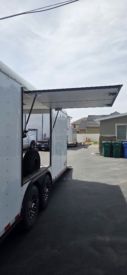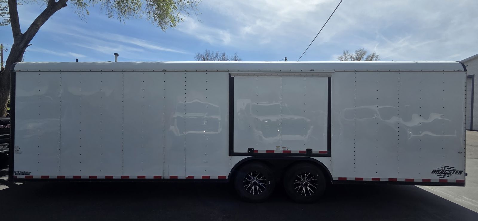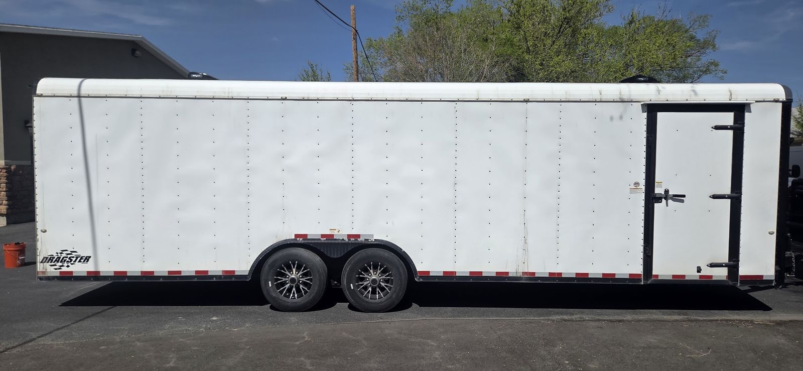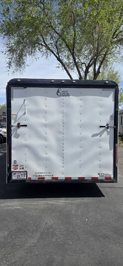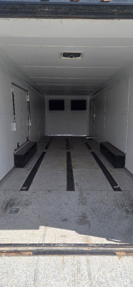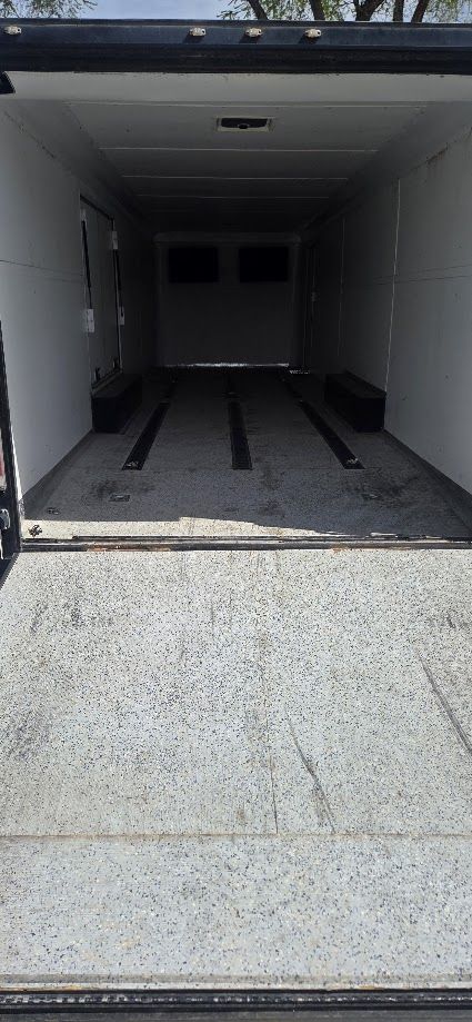 2018 Cargo Craft 8.5'x28' Trailer. Model #BAC85282 (2) 8-lug axles, 2 roof vents, 7' tall ceiling, LED lighting inside and outside. The floor inside is finished like a garage, very durable. 3 rows of E-track inside the trailer, lots of places to tie down. Cabinets on the front inside wall for storage. 3 doors to access the trailer.
