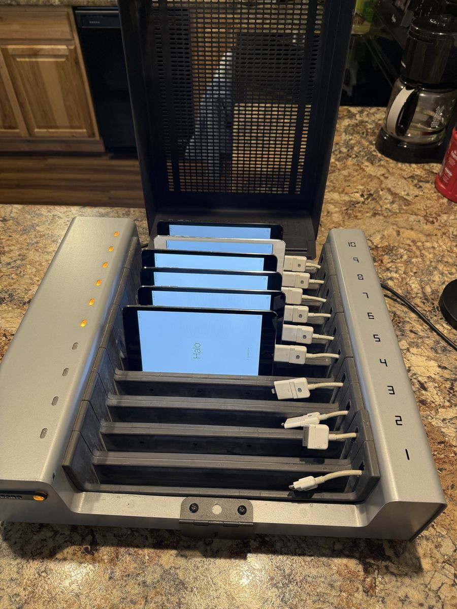 This charger unit is fully functional and charges up to 10 ipads. Included with the $60 price is the unit itself, power cord,10 ipad chargers, and 8 lightning charger adapters for those chargers. Unit has been tested and does charge ipads. Unlike many listings on Ebay for this unit, the above chargers and adapters are included with the price.