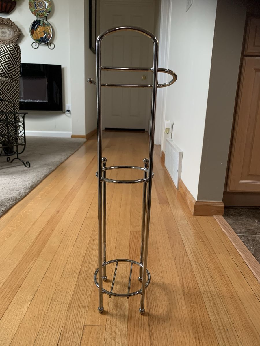VenmoThe top holds one and the base keeps three more handy. Steel with satin nickel plating to brighten up your bathroom. The steel base keeps it from tipping. 26”H x 7 3/4”W x 6”D. Clean and ready to go. Venmo to hold. Non-smoking/No pet home.