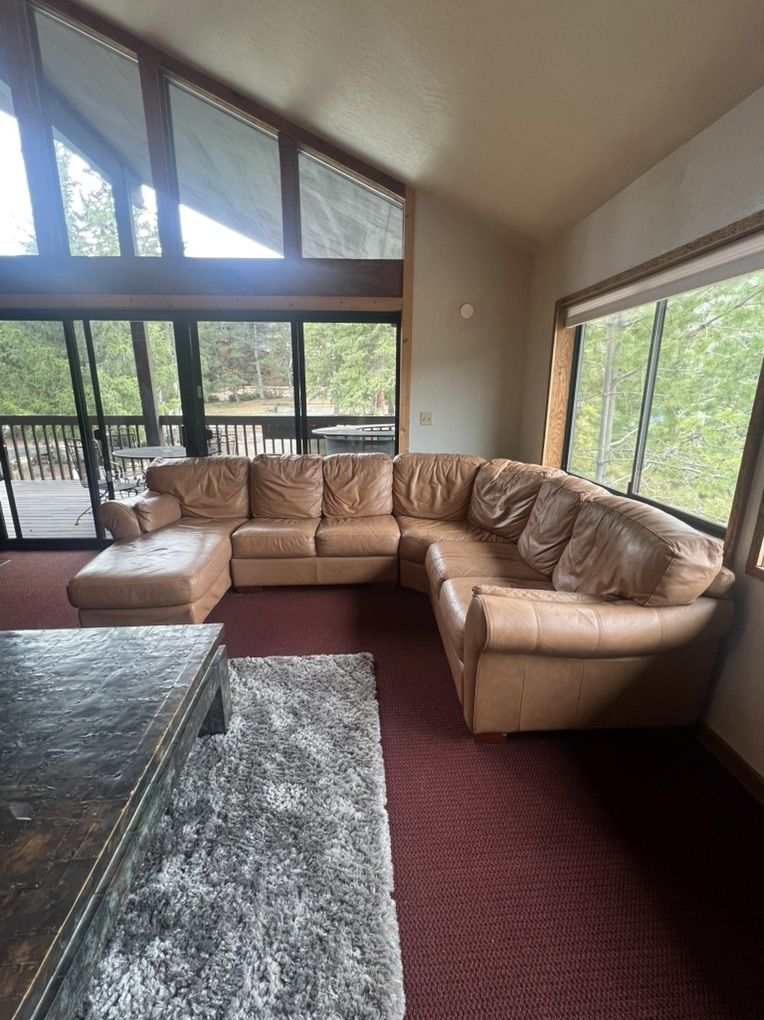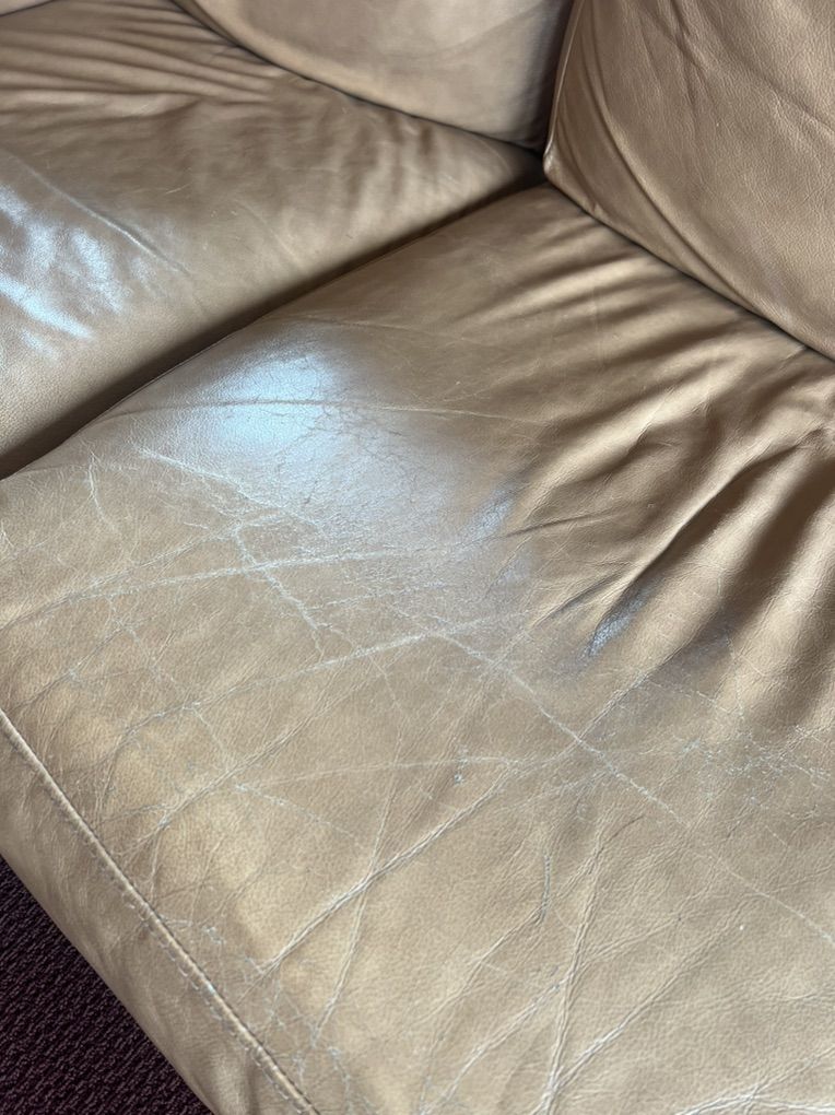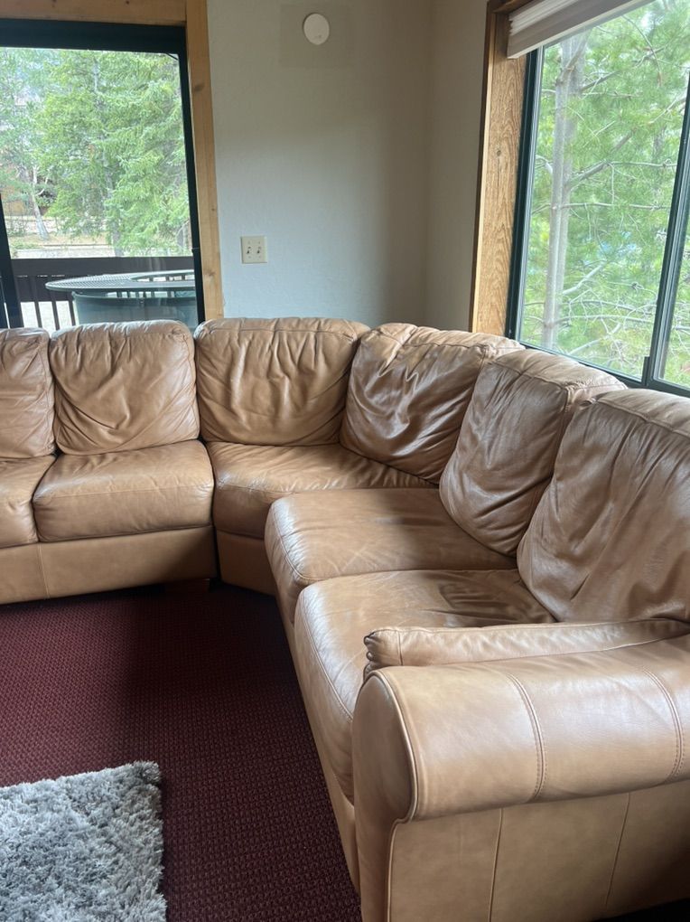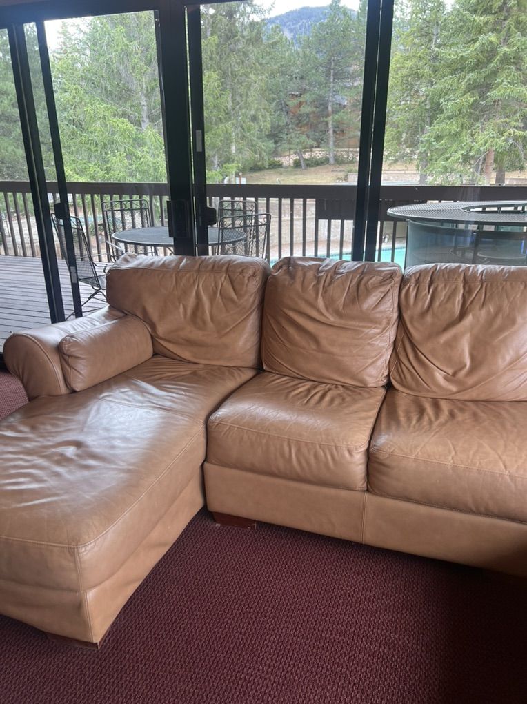 VenmoSectional L-shaped Leather Sofa Tan. In good shape, some wear but no rips. Length: 7’ by 8.5’ Depth: 3’ Chaise length: 5’