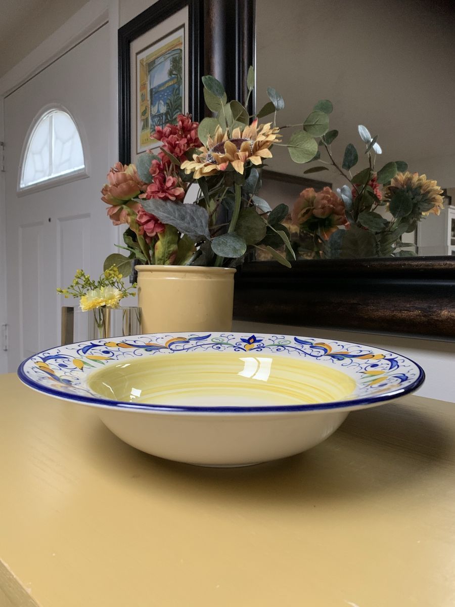 VenmoAdd beauty to your table with this 13 3/4” serving bowl. Hand-painted with floral and scroll designs in blue, yellow, and green colors. Clean. Venmo to hold. Non-smoking/No pet home.