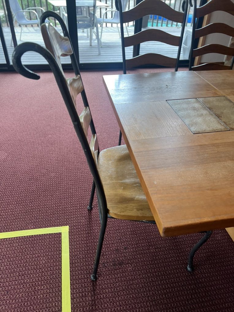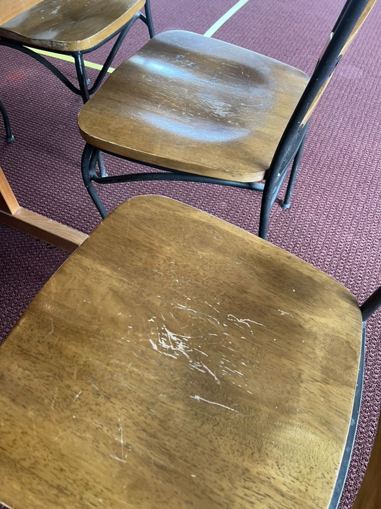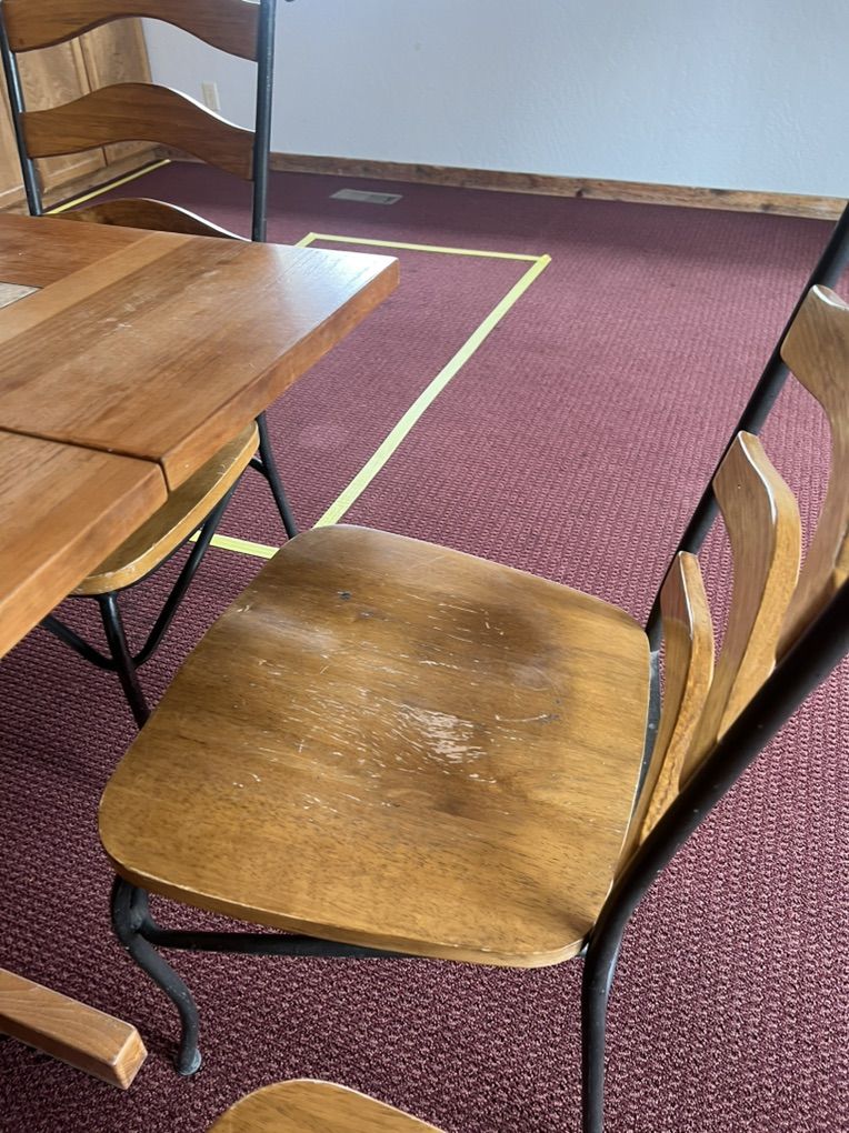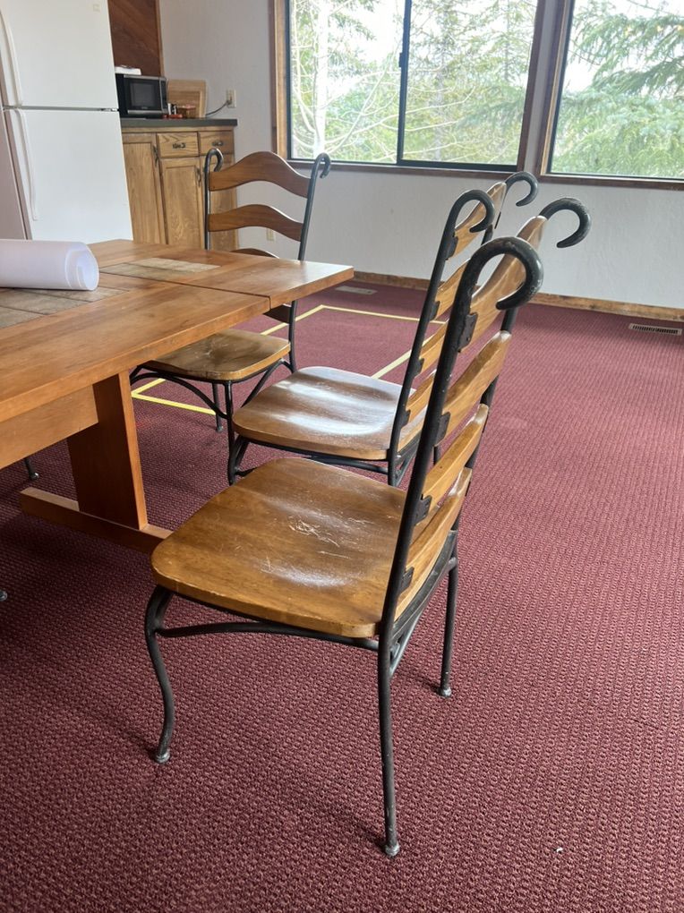 Venmo8 wood and iron dining chairs. Some look a little worn, but sturdy. May just need some furniture polish.