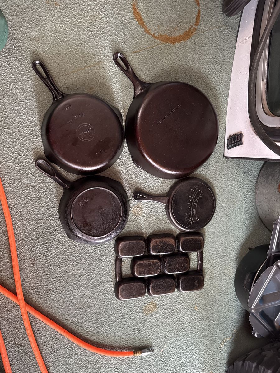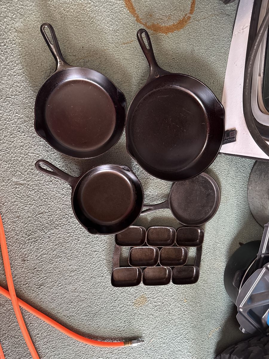 Cast-iron kitchen cookware. $65.00 for all or. 11 3/4 inch frying pan $15.00 9 inch frying pan $15.00 8 inch frying pan $15.00 7 inch skillet $10.00 Biscuit tray $15.00 Or $65.00 if you take it all.