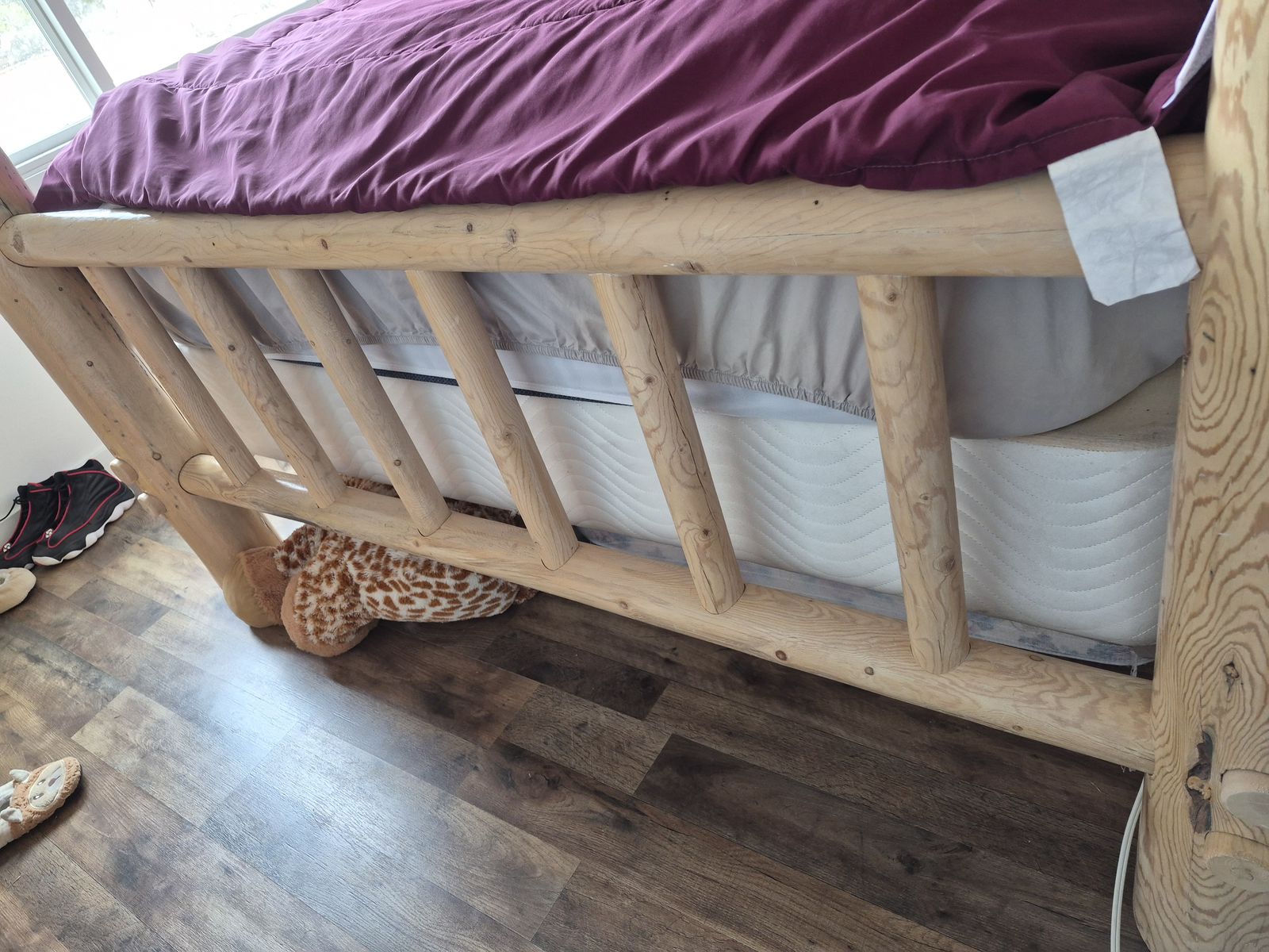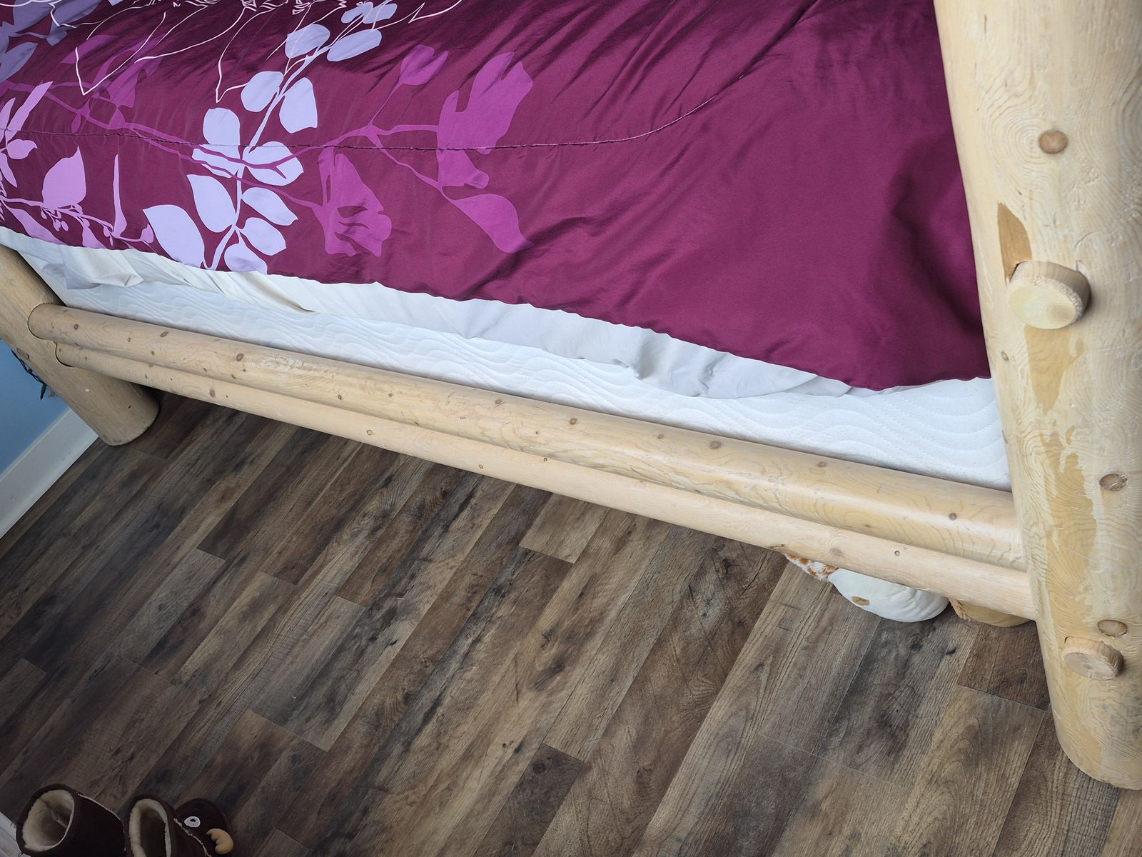 Queen log bed ready to go you pick up any time on week days after 5 and any time Saturday, good condition nothing wrong smoke free/ mattress not included or boxspring,will only accept cash!