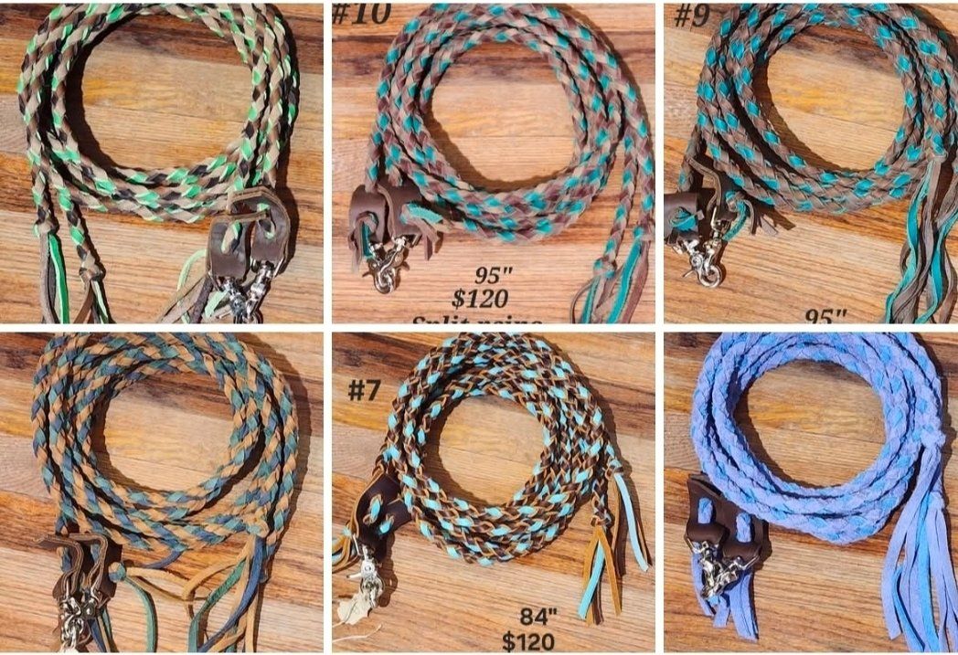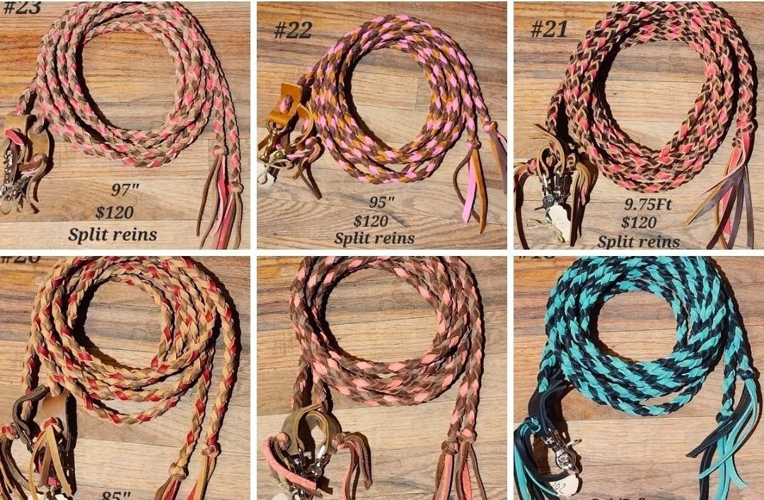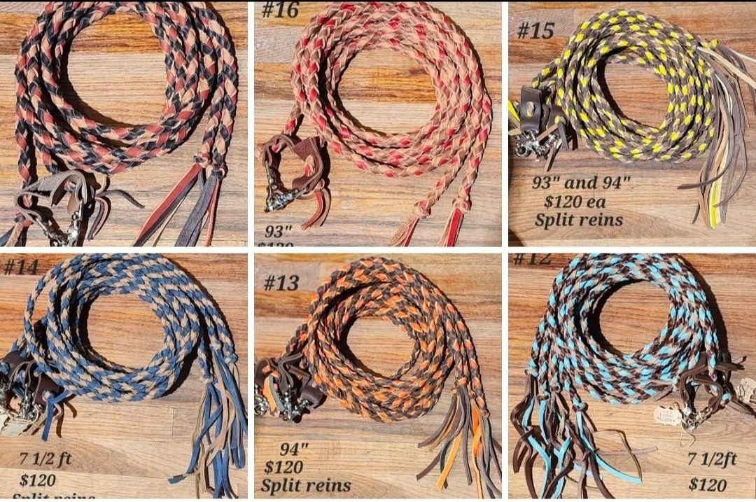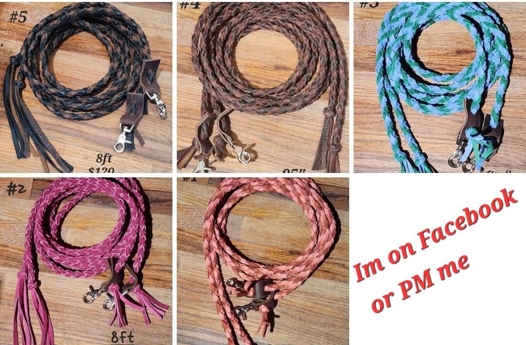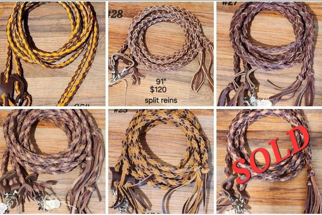 I sell leather braided reins, find me on Facebook under C.M.Braiding. Right know I have a sale on all my finished split reins. $100 ea, thats $20 off, plus free shipping all over the USA.. All reins are pictured, plus you can go to my facebook page and look through my Album if available reins.