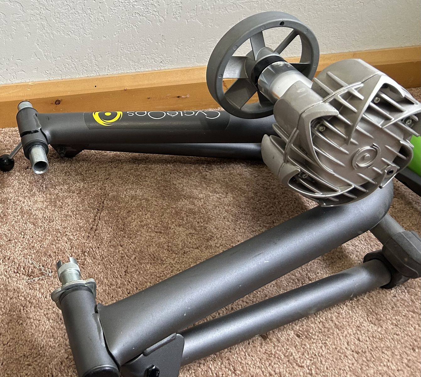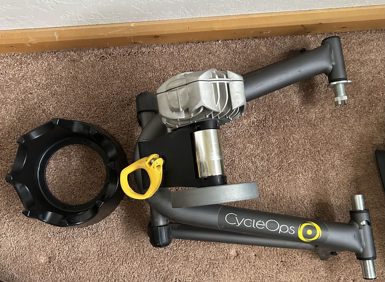 VenmoCycleOps bike trainer Used for indoor stationary cycling. Uses a flywheel and resistance unit to simulate outdoor riding conditions. Provides progressive resistance, meaning it gets harder to pedal the faster you go. Designed to hold a standard bicycle by its rear wheel. Features: Paired with a climbing block for the front wheel to level the bike.