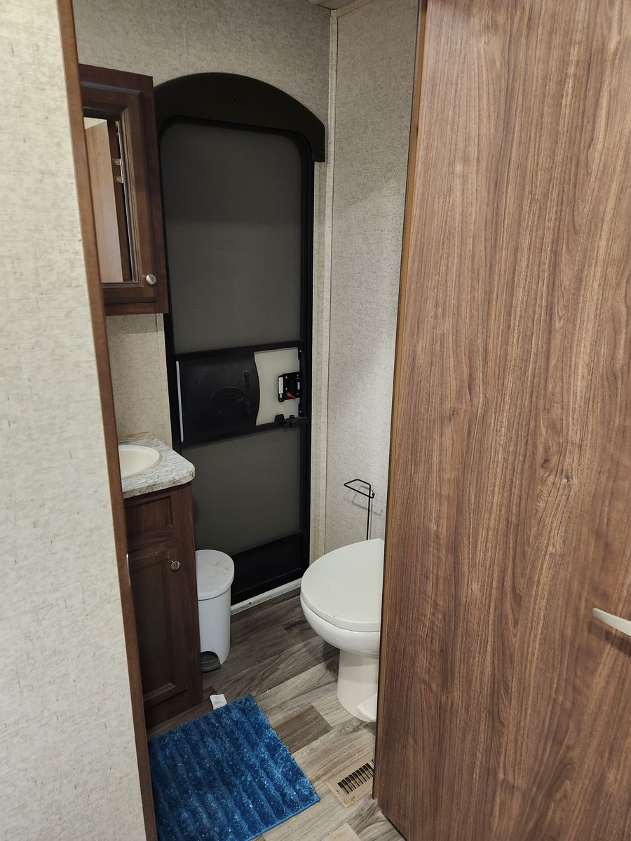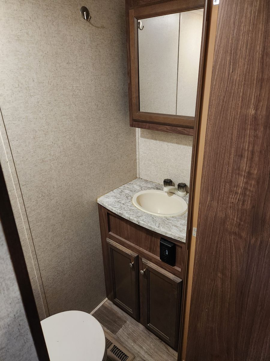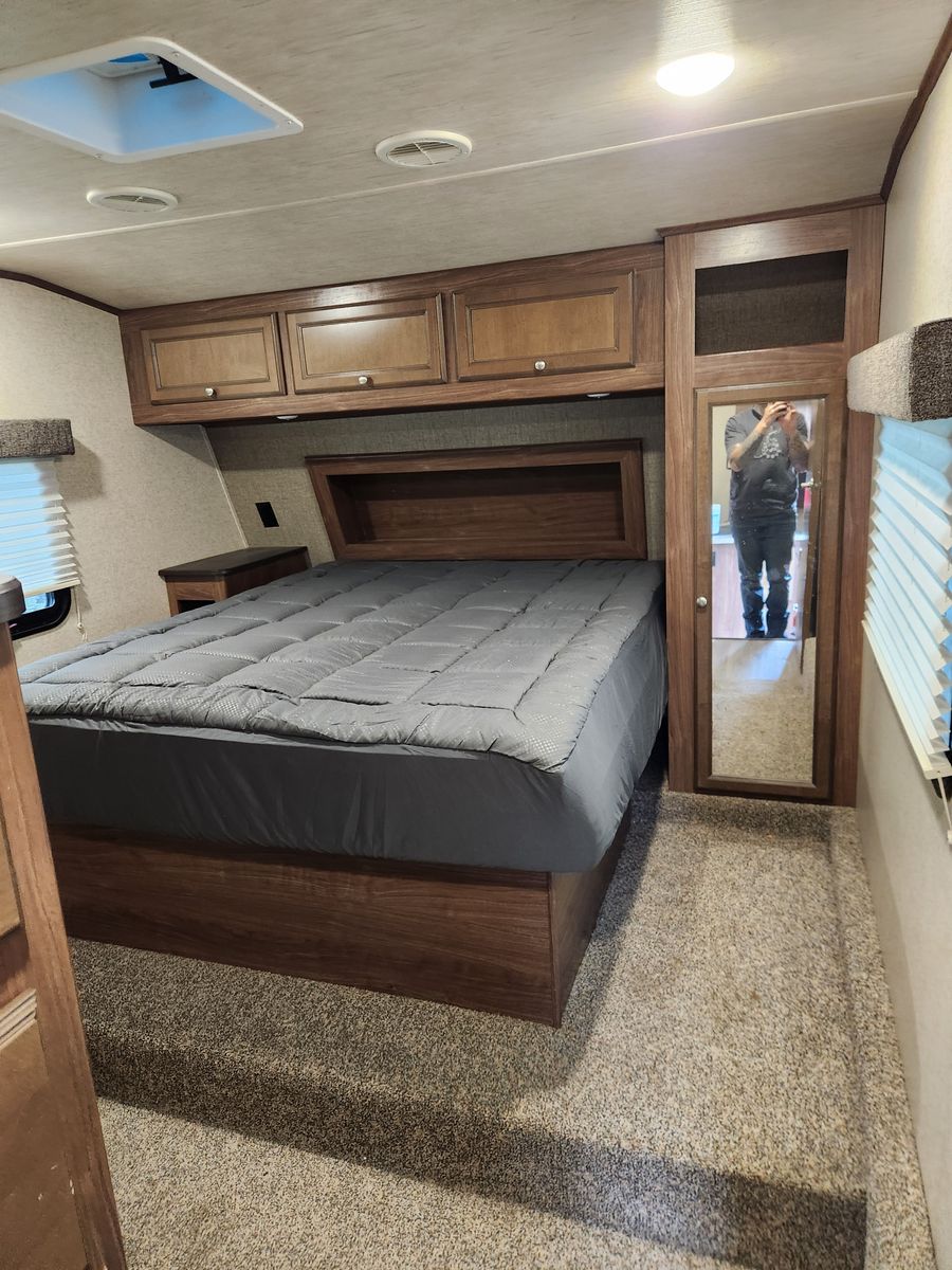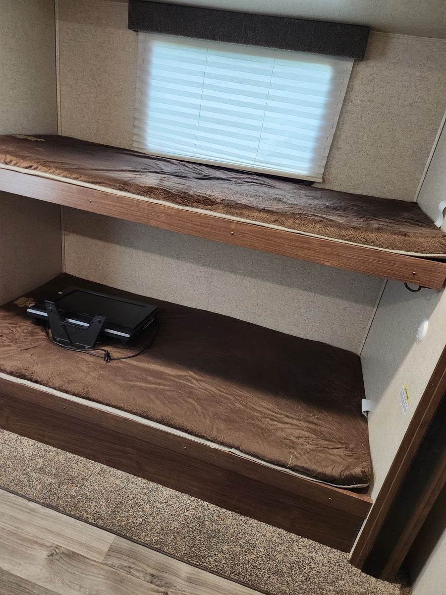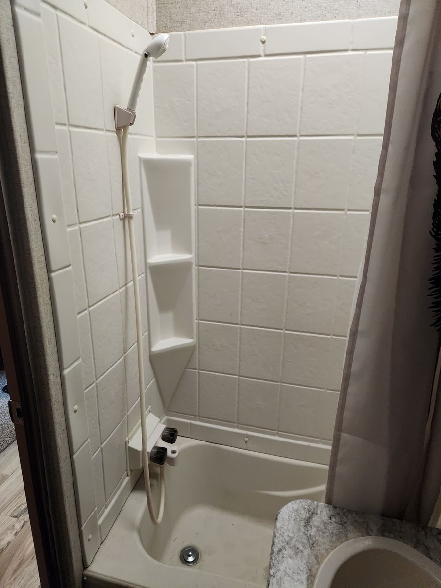 Everything works great. Has solar, electric jacks, bunkhouse with 3 beds in the back and queen bed in the front. 2 bathrooms. Yes, master bedroom has its own private bathroom! This thing has been great! Tows like a dream. But now that it is just me most of the time it is bigger then what I need/ want. Clean title in hand.