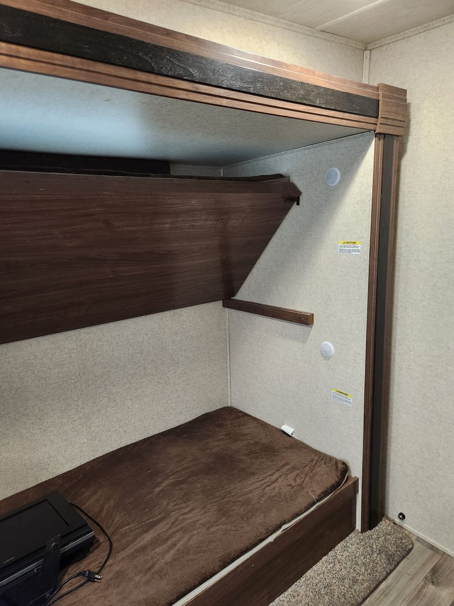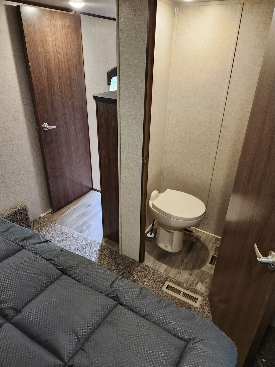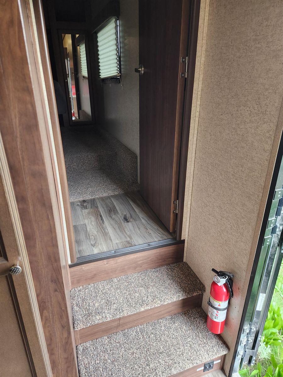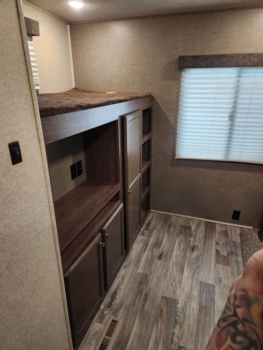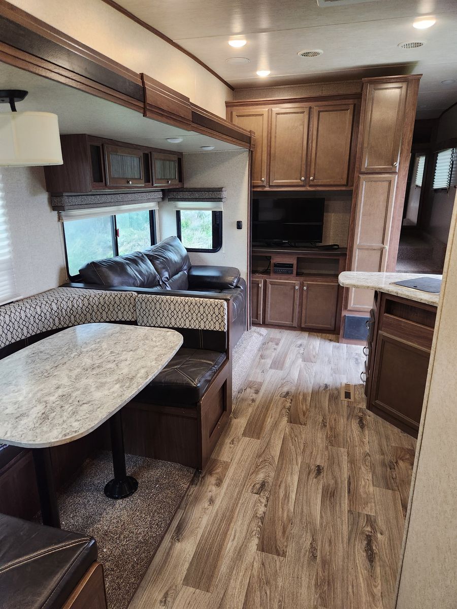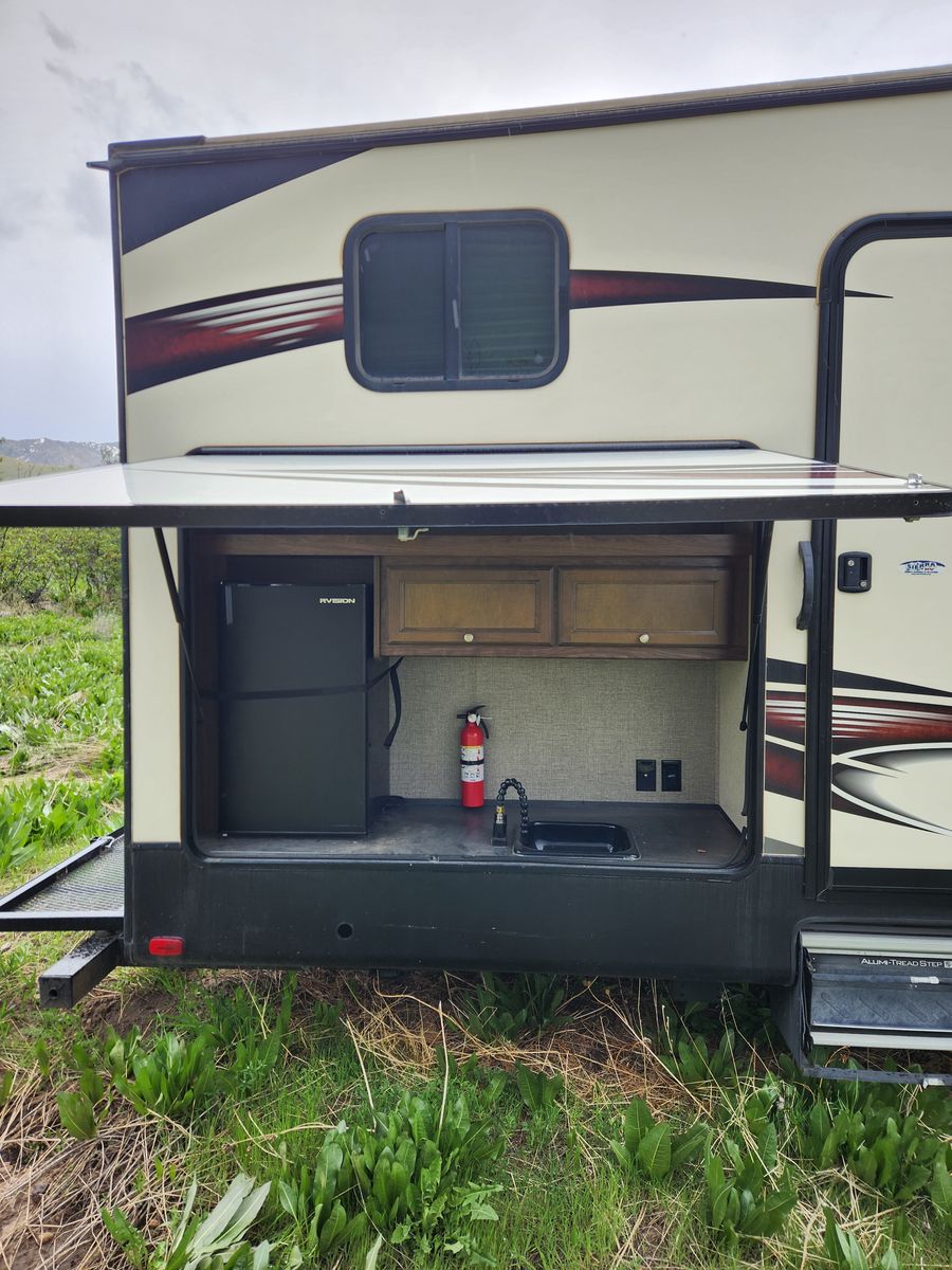 Everything works great. Has solar, electric jacks, bunkhouse with 3 beds in the back and queen bed in the front. 2 bathrooms. Yes, master bedroom has its own private bathroom! This thing has been great! Tows like a dream. But now that it is just me most of the time it is bigger then what I need/ want. Clean title in hand.