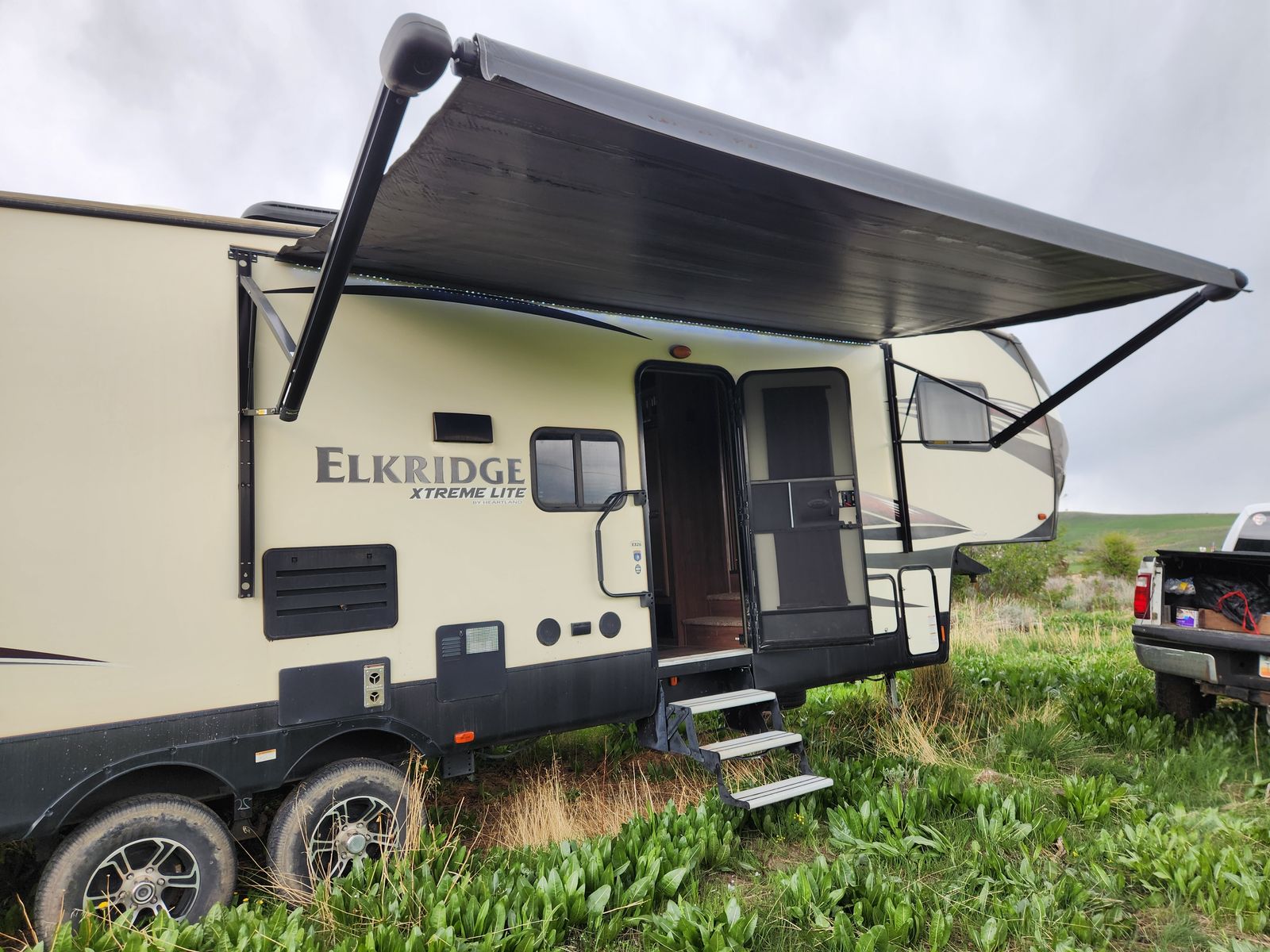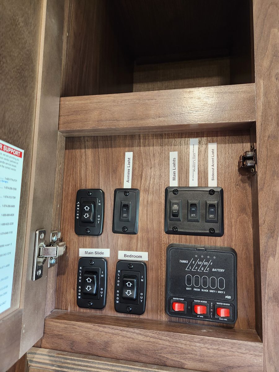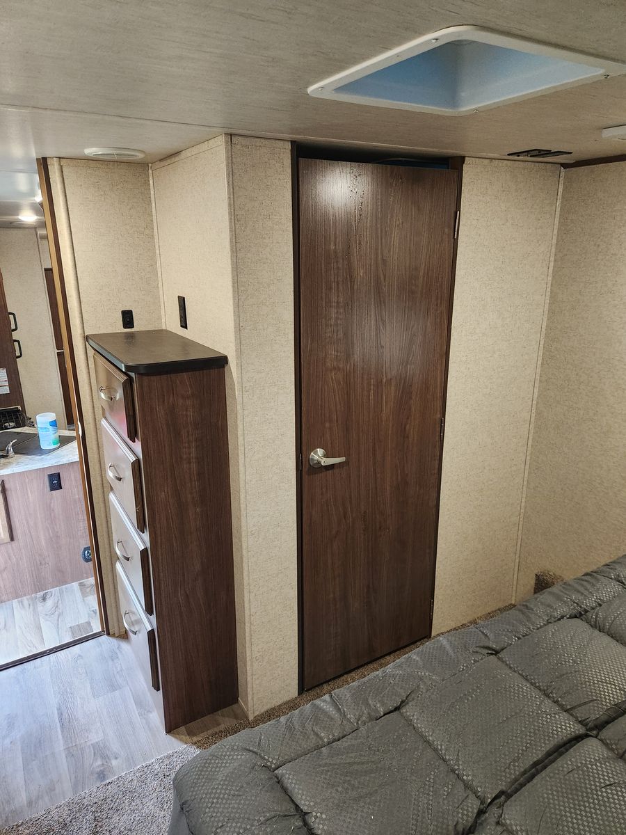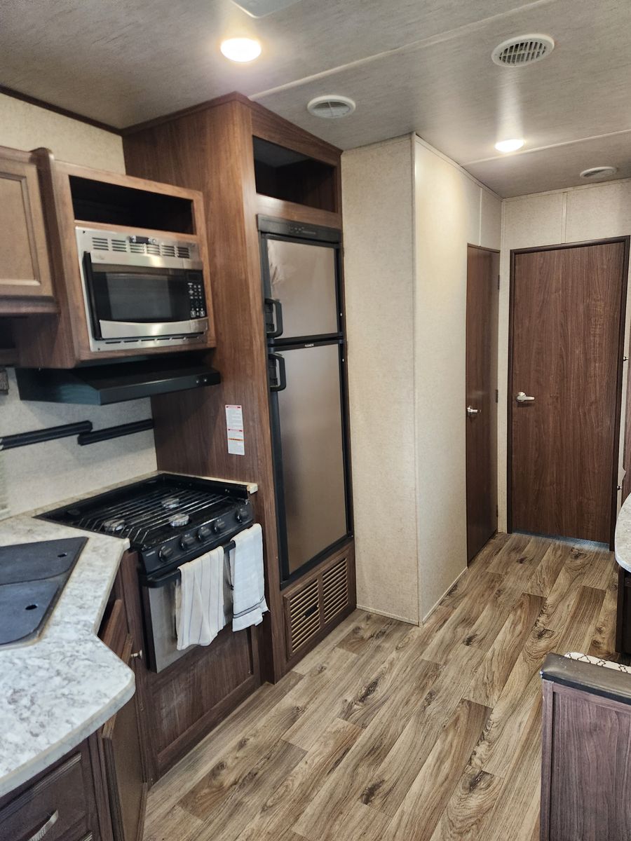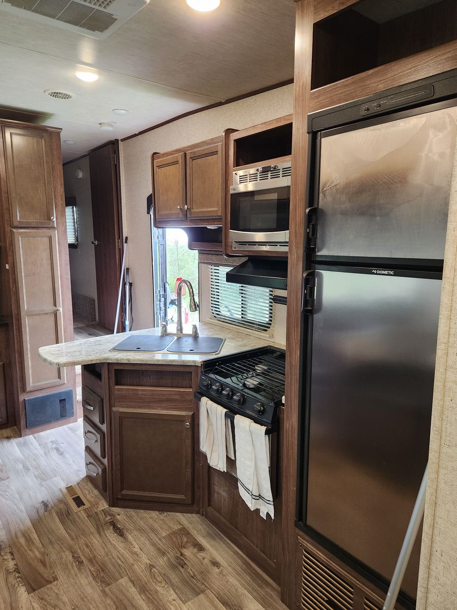 Everything works great. Has solar, electric jacks, bunkhouse with 3 beds in the back and queen bed in the front. 2 bathrooms. Yes, master bedroom has its own private bathroom! This thing has been great! Tows like a dream. But now that it is just me most of the time it is bigger then what I need/ want. Clean title in hand.