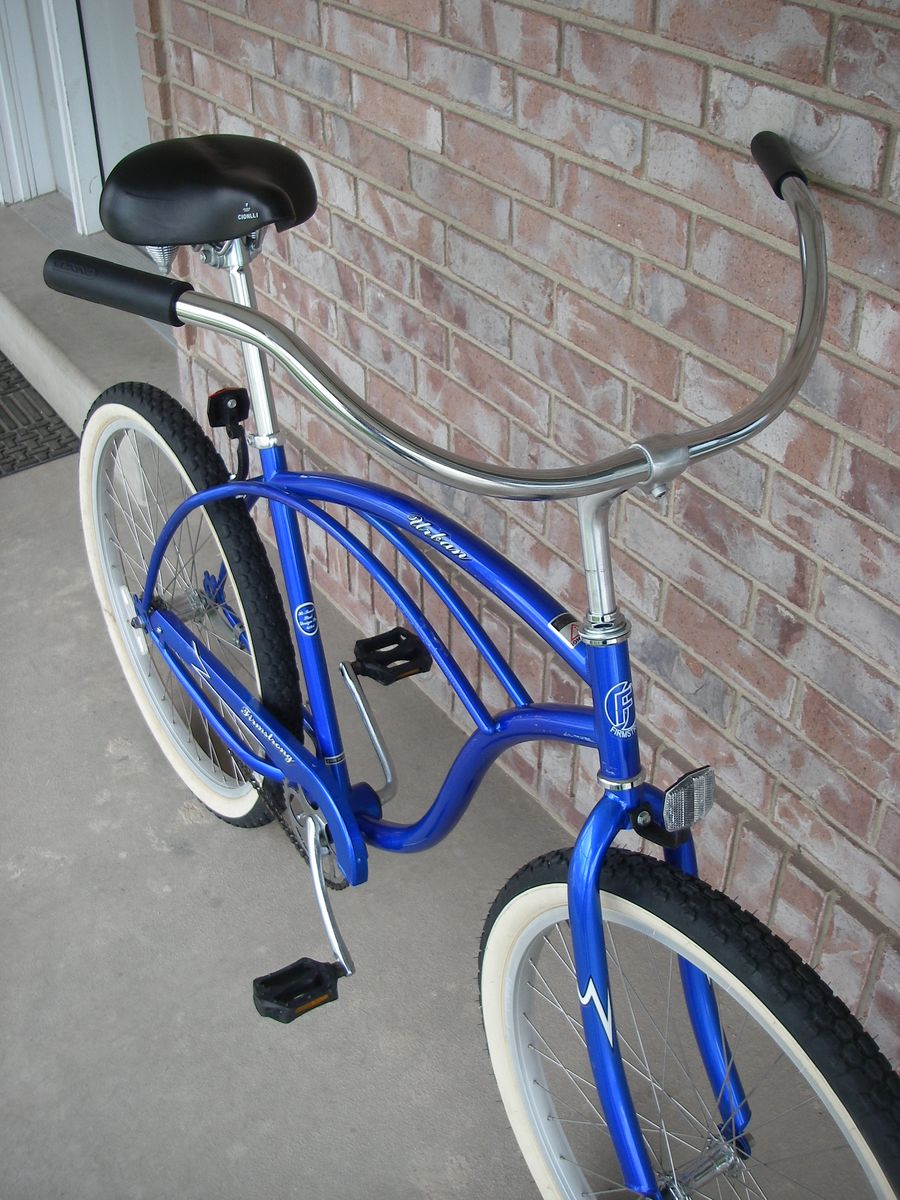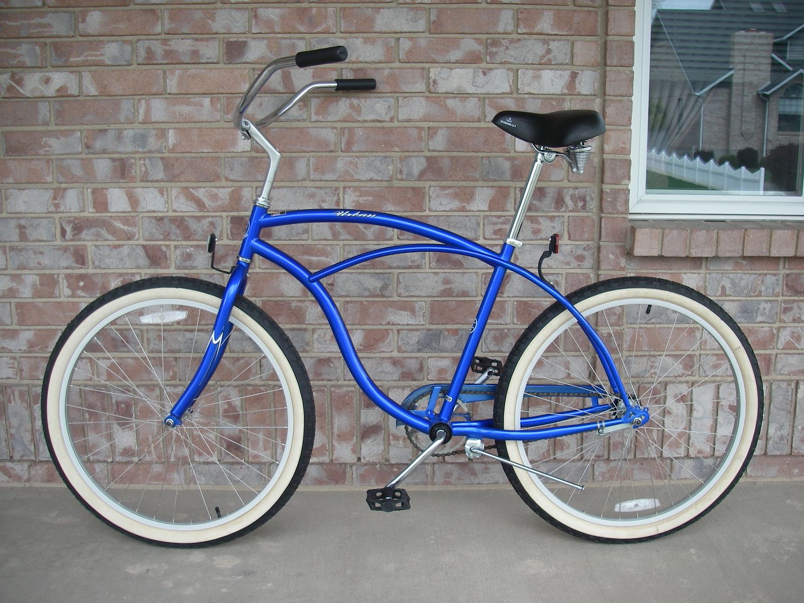 Large Mens 26" (wheel size) FIRMSTRONG URBAN Beach Cruiser Bike, Blue. Coaster Foot Brakes, Kickstand, Large 19" Frame. Has a long seat post which allows up a 36 inch "pants inseam" measurement from top of seat to down pedal (shortest is 29"). Kenda tires. Alloy Rims, HB Stem & Neck.