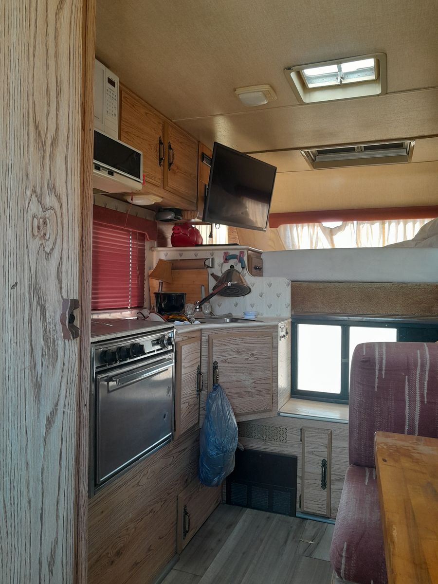 GooglePayThis baby was in fantastic shape never a leak and every button on it works fine. Then it tipped over in our wind storm the other day and the door blew off and it made it go from worth about $5,000...dang it, my loss your gain. It has a one piece stainless roof and therefore there has never been a leak in it. A brand new memory foam mattress, stereo, brand new smart TV. Refrigerator, heater, swamp cooler AC all work just perfectly. The toilet works fine and is in good shape. The exterior is now quite banged up and we'll need extensive refurbishing. But it still doesn't leak or anything like that it just looks crummy. Needs a paint job probably. It is a big camper and probably needs a long bed big truck. I have 2500 long bed. I can help deliver locally and can deliver for additional cost if you need. Thanks for having a look. Edward 435. 640. 6397