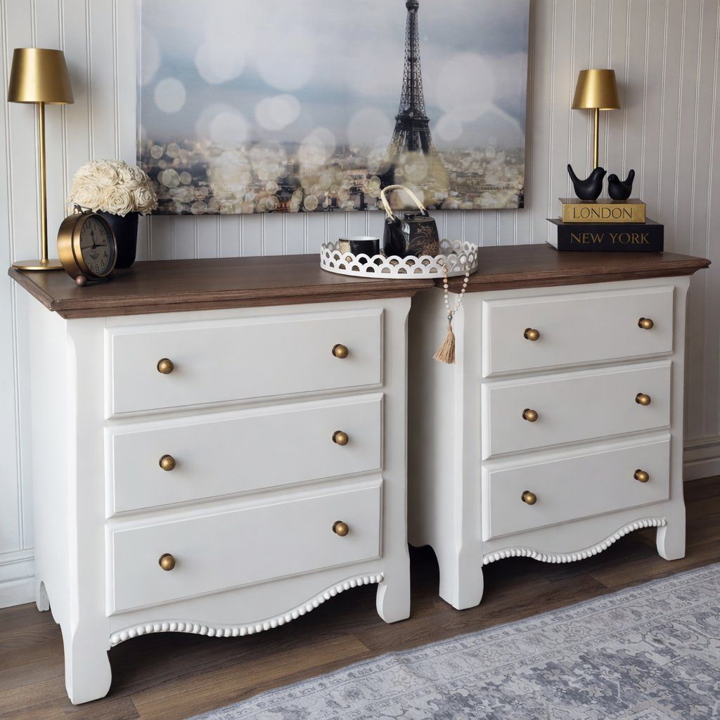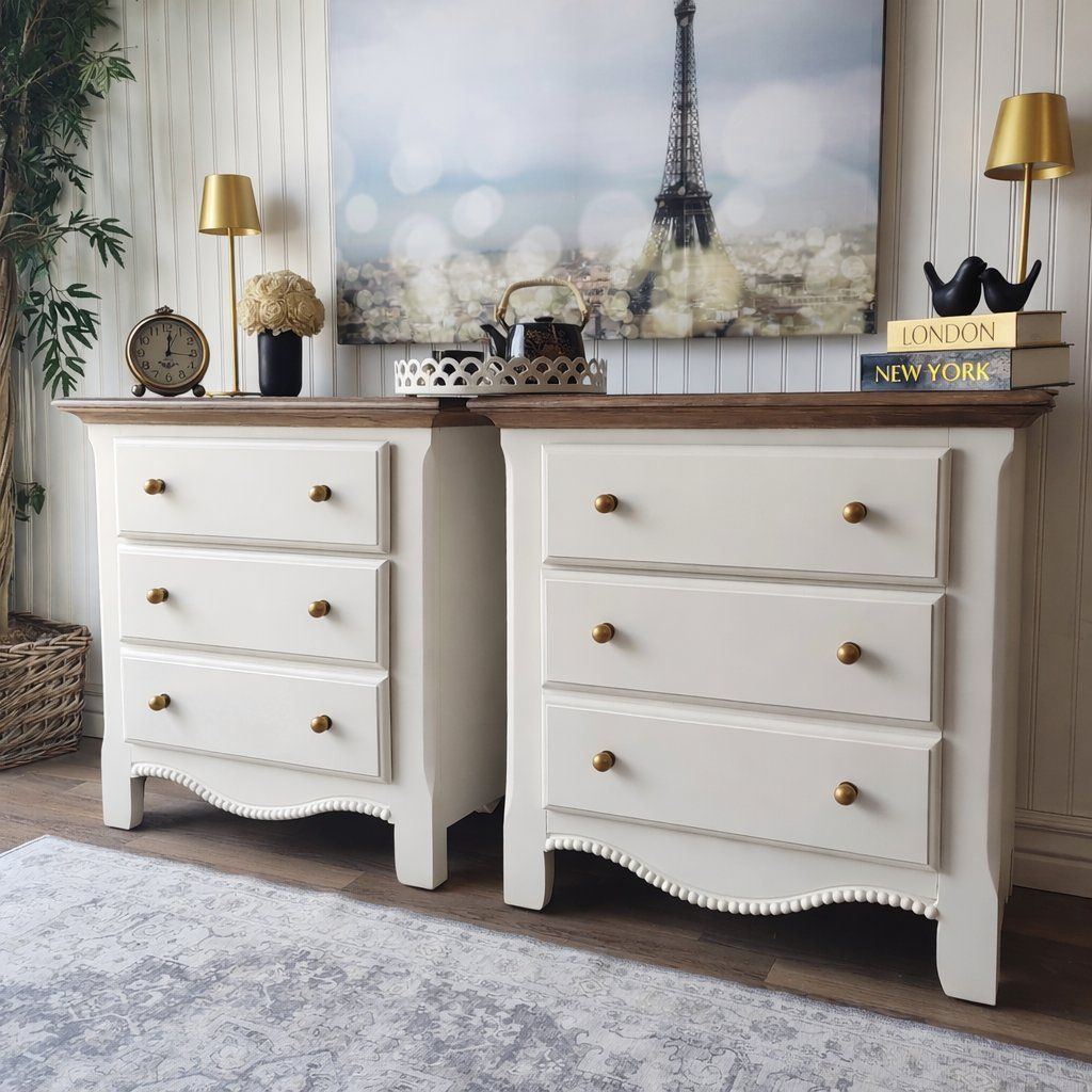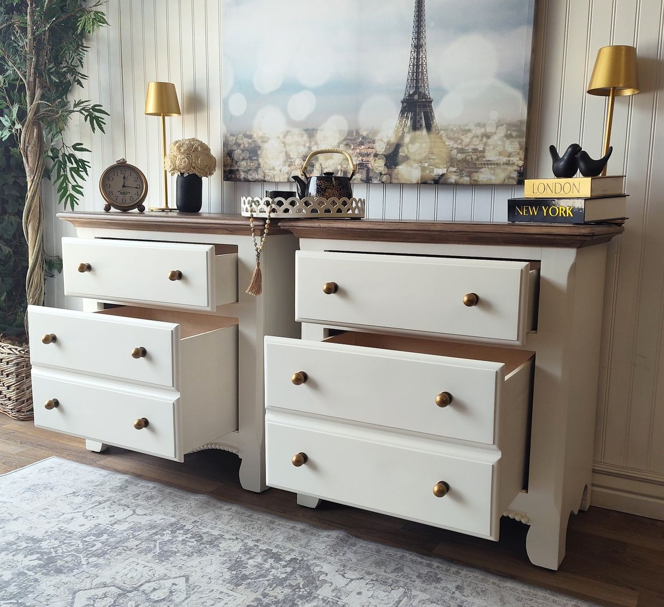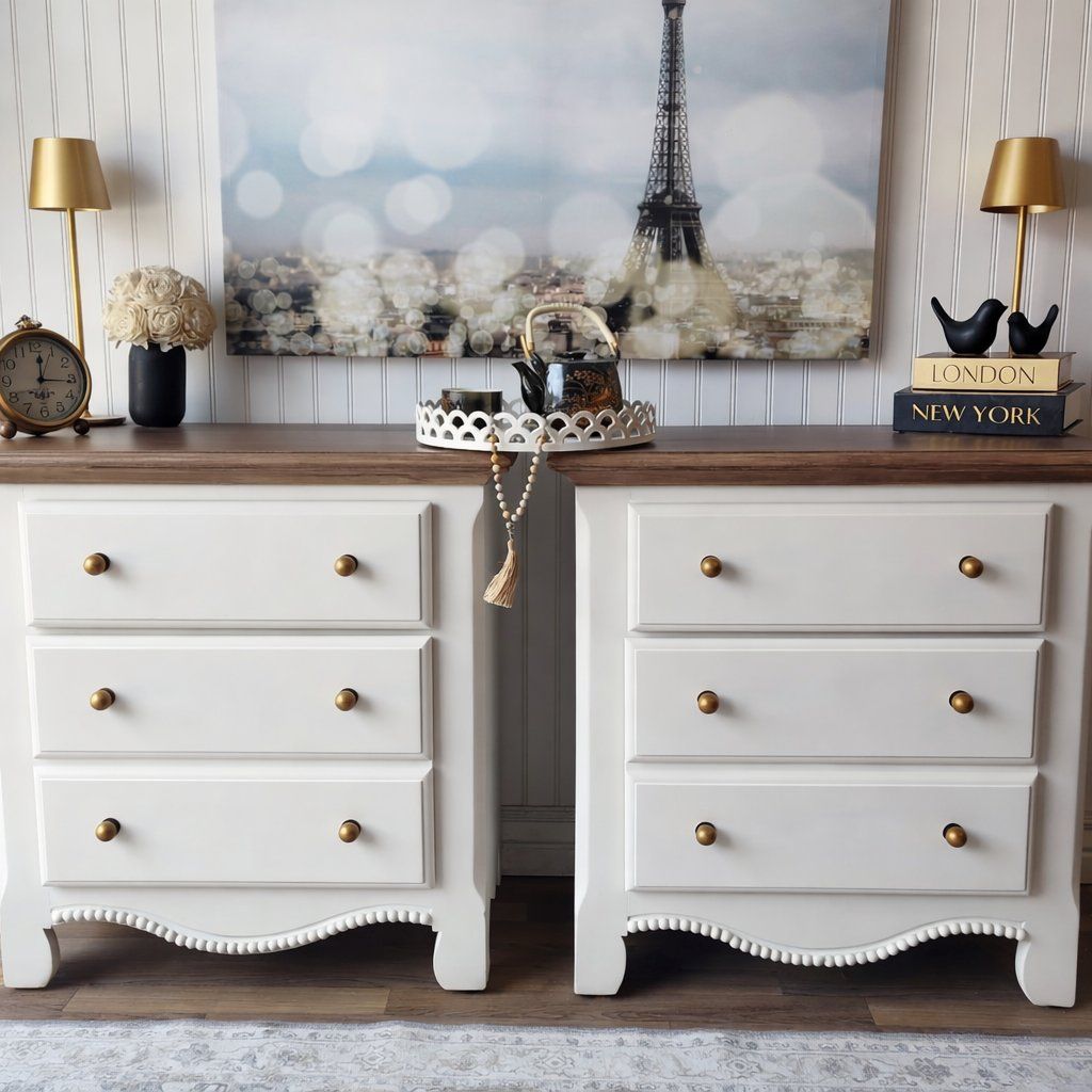 These feature: • Dovetail construction • 100% solid wood • Reinforced joints • Backs and Bottoms refinished as well • Bottom drawer is very deep, offering plenty of room for storage • All drawers operate smoothly on metal rails • Bumper pads added to drawers for soft closing • Wax sealed interiors • Professional grade enamel cabinet paint (professional air-compressor gun) • French Toile wallpaper - sealed for long-term adhesion • Brushed-on (painted) cool walnut grain on the tops (no orange tones- Pottery Barn technique) • New antiqued-brass hardware • New felt feet/risers protect furniture • Padded/Foam wrapped for protection in transfer • Small on/off lights in top drawers in case of power outages or emergencies • "Soft sanded" which makes these buttery smooth to touch • Matching tray included