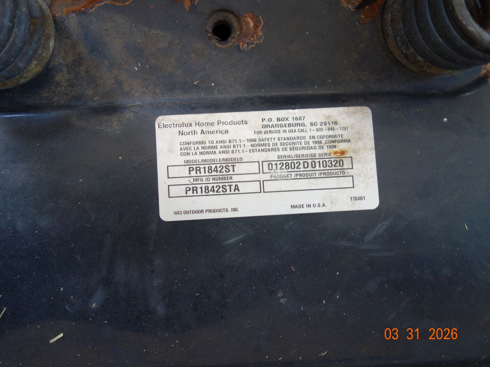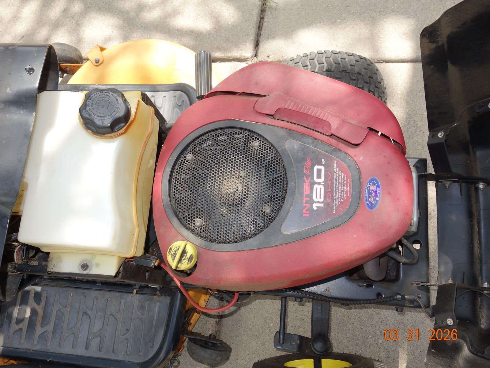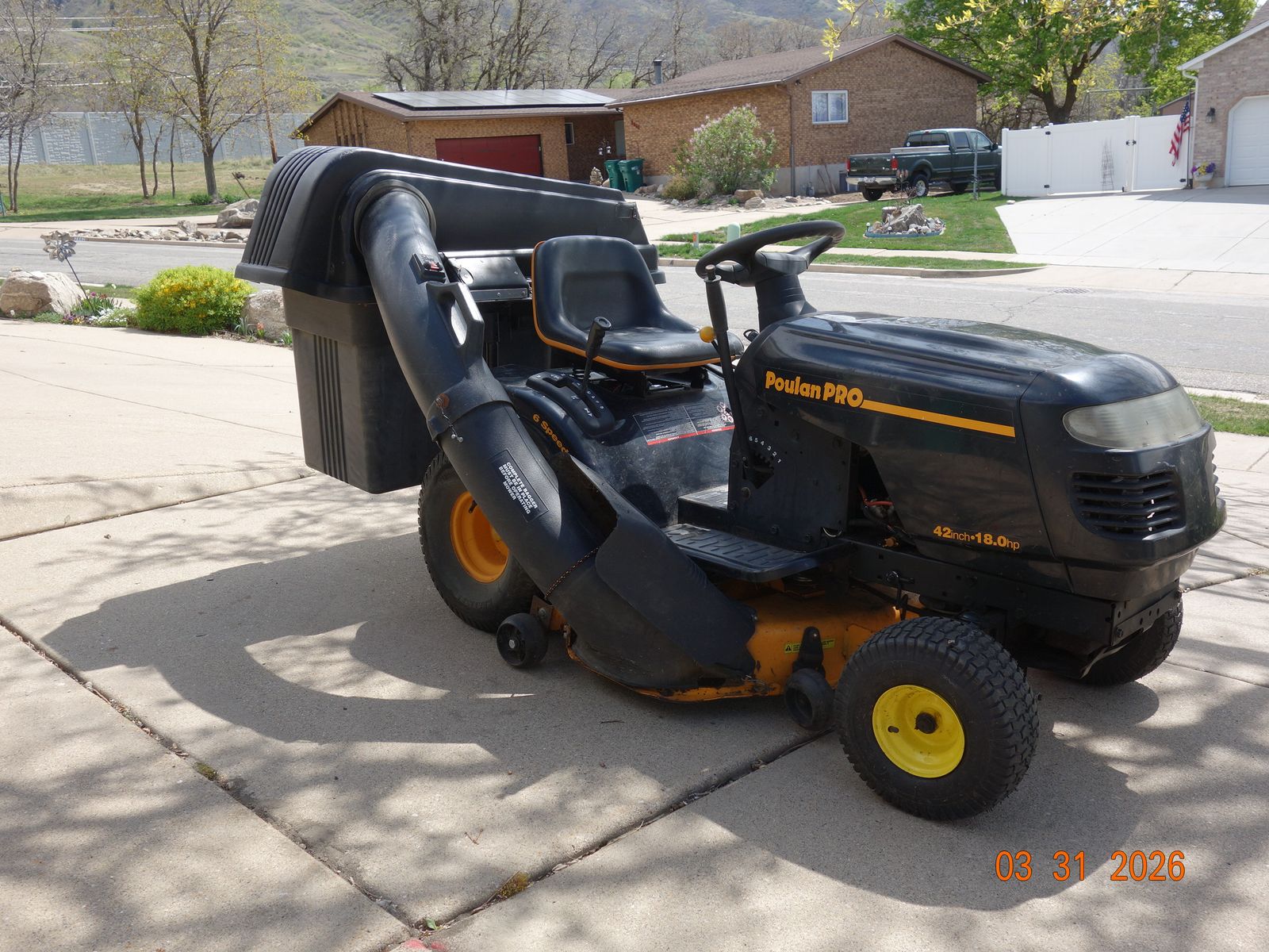 This Mower is an 18 HP 42 " mower with a Craftsman bagging unit. Runs well, tires hold air, the front tires were replaced this year, has had a recent oil change, blades just sharpened, battery is less than 1 year old, spindles and belt were replaced last year. It has a crack in the seat, and I have mounted deck wheels so the deck follows the lawn surface more evenly for a more uniform mow. The bagging unit functions well but has some flaws.