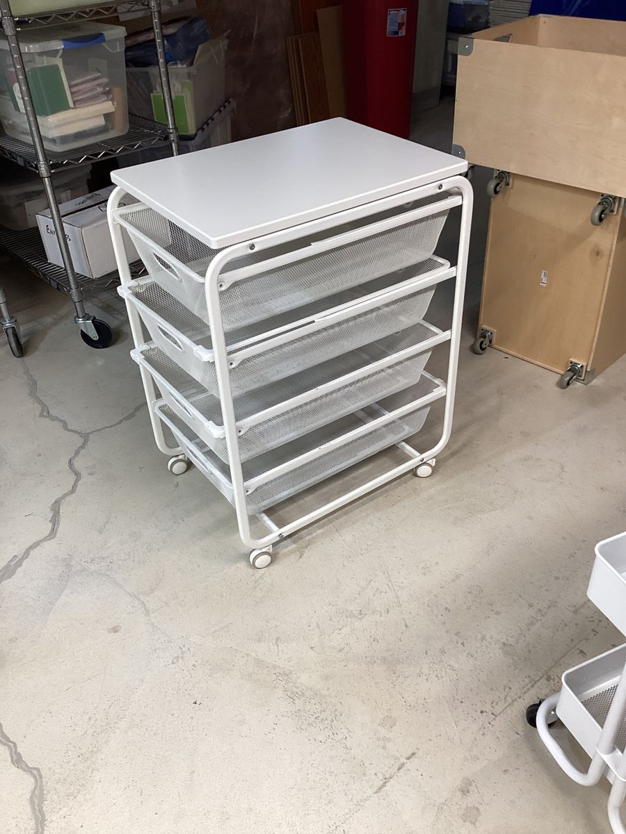 VenmoStorage cart with pull out baskets on casters. Basket dimensions on bottom are 20.75” L x 11.5” W and 5.5” deep. Frame dimensions are 30” H x 23.5” L x 18.25” W